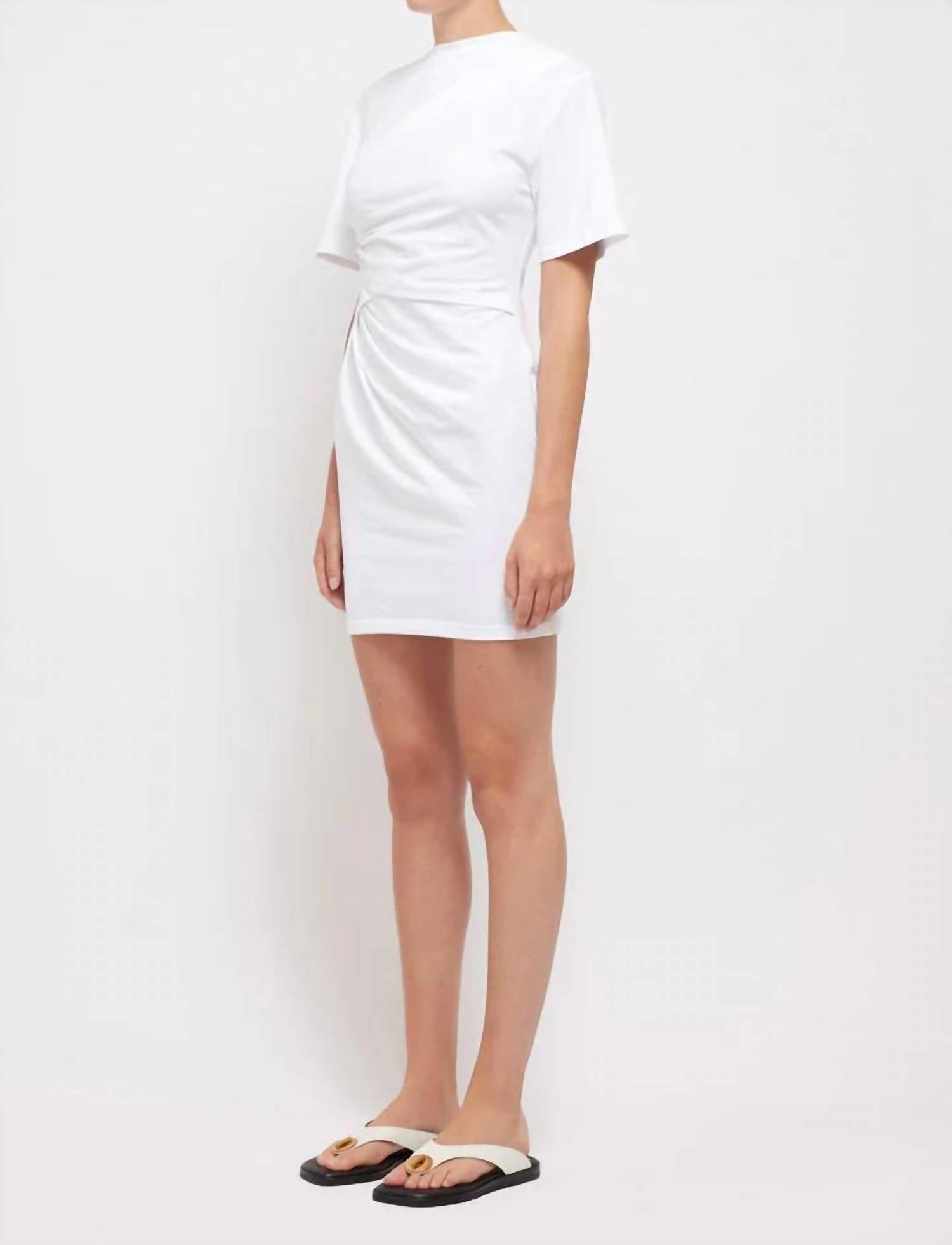 The kind of easy and flattering dress you'll be reaching for all season long. Meet the Zeus T-Shirt Mini Dress by SIMKHAI, an elegant white piece perfect for any dinner party or Easter gathering. Crafted with short sleeves and subtle rouching, this dress provides a figure-enhancing silhouette in a comfortable shift fit. Composition: 93% Organic Cotton, 7% Elastane. Closure: Pull on. Care: Machine wash, tumble dry. Ideal for the spring season, this dress is true to size and a timeless addition to your wardrobe.