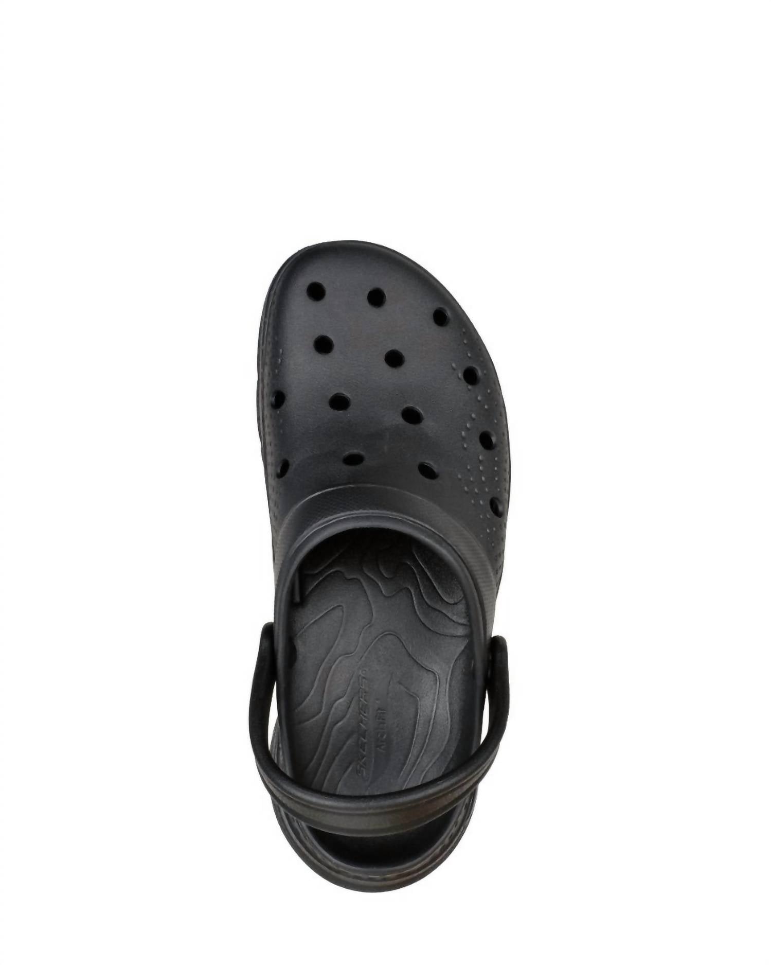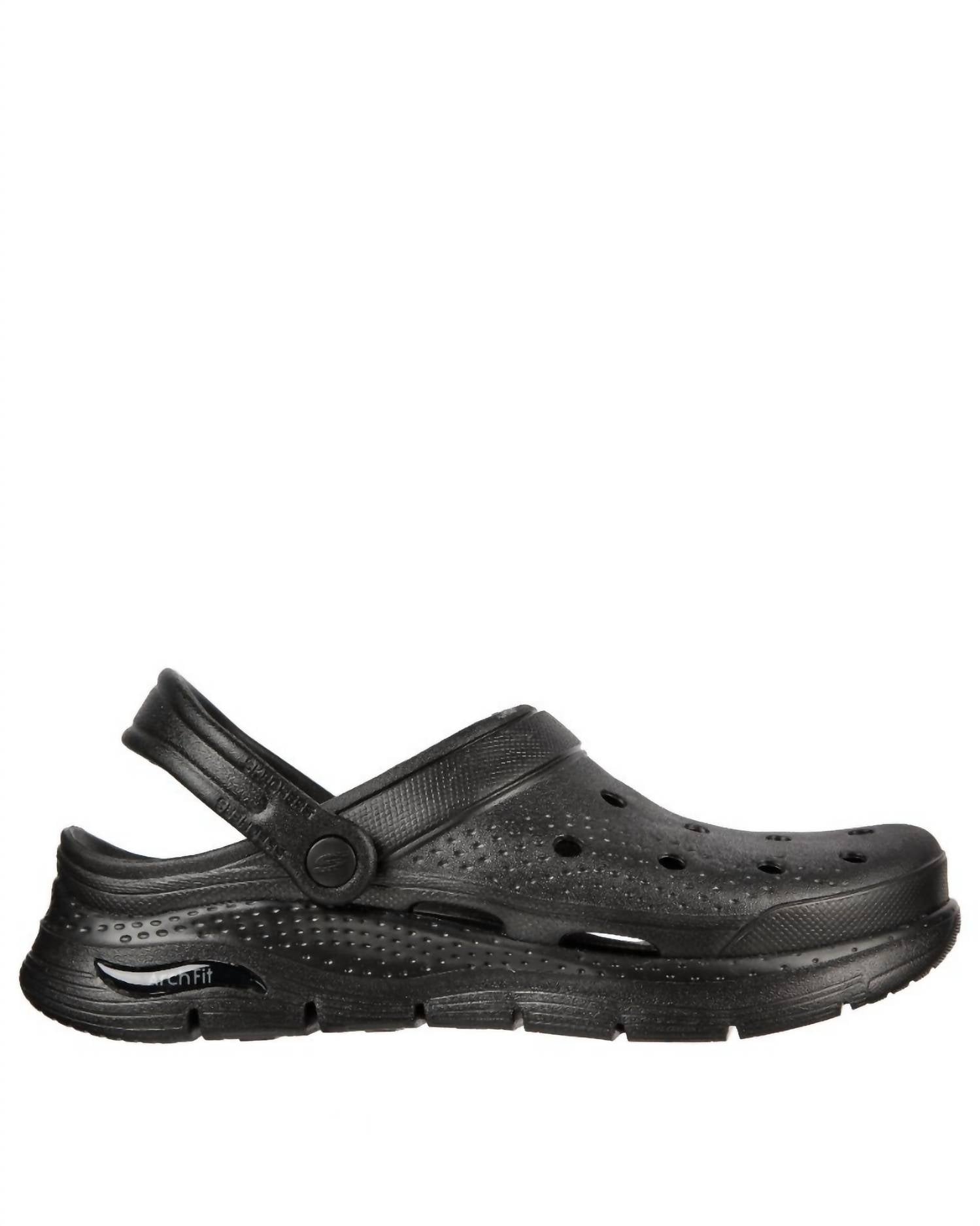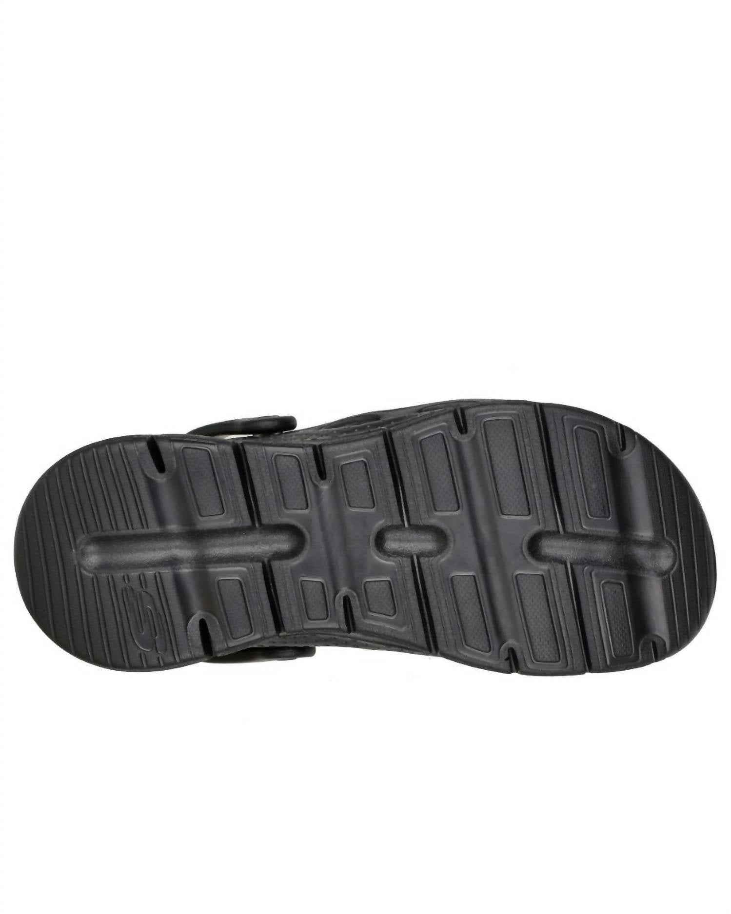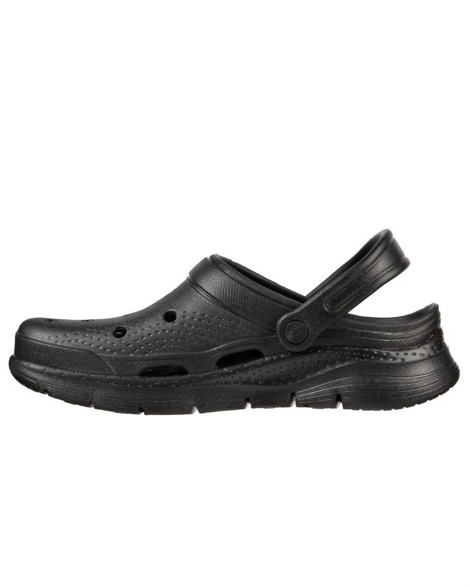 Introducing the Skechers Men's Valiant Clog in a sleek black colorway, perfect for minimalist spring travel. These clogs feature a round toe and the patented Skechers Arch Fit® insole system for podiatrist-certified arch support, with a footbed designed to mold to your foot for shock reduction and improved weight dispersion. The lightweight upper is crafted from sculpted Foamies® EVA, complete with a convertible heel strap for versatile wear. Care instructions recommend hand washing and drying in the shade, ensuring long-lasting comfort and style.