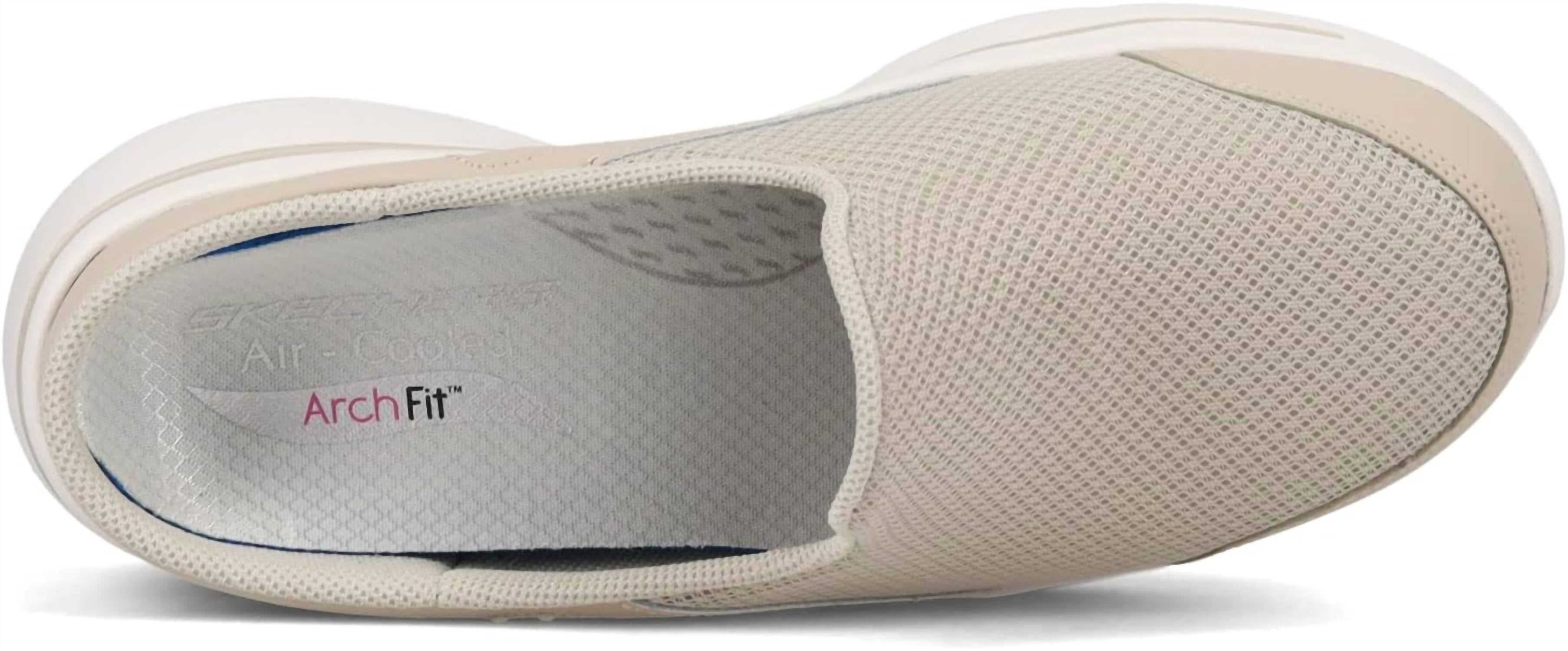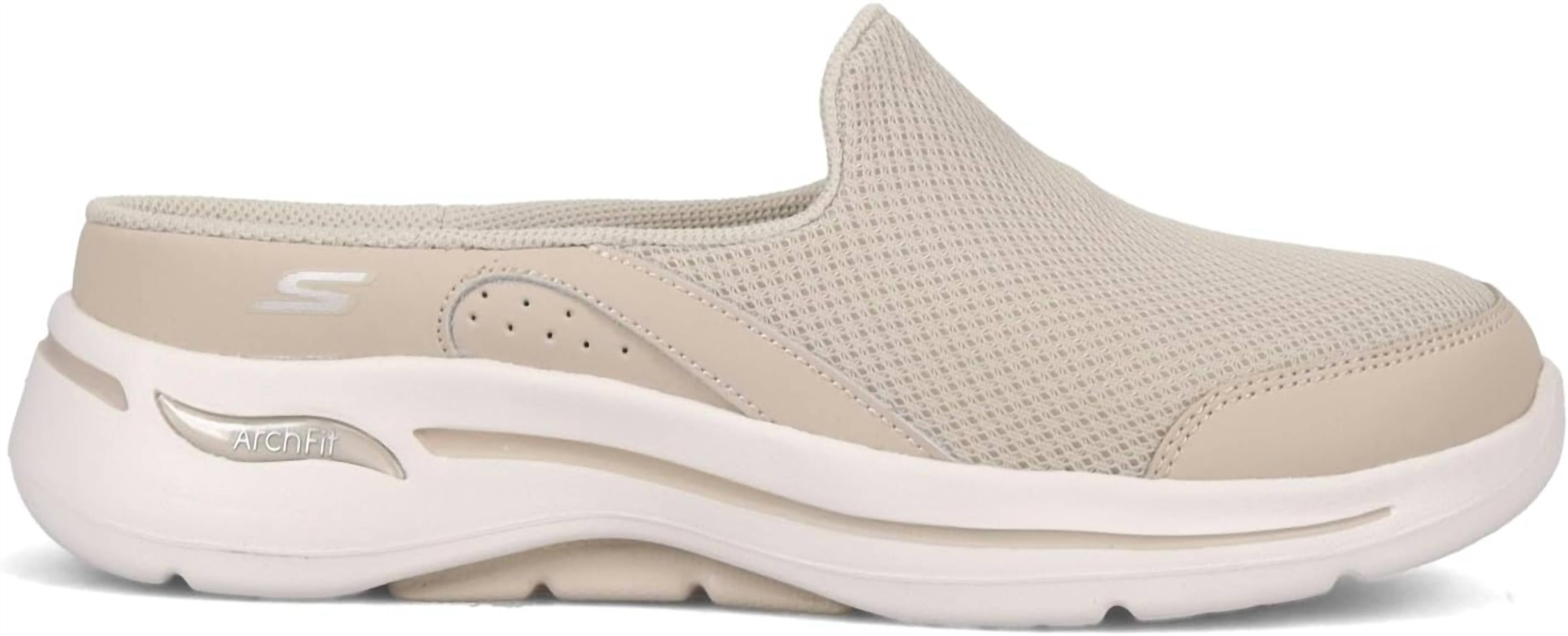 Cute, functional, and comfortable. These sneakers check all the boxes. Step into comfort with the Skechers Women Go Walk Arch Fit Seven Seas Sneaker in taupe, featuring a smooth leather and mesh fabric upper. This slip-on sneaker boasts a patented Skechers Arch Fit™ insole system with podiatrist-certified arch support for ultimate comfort. It also includes lightweight, shock-absorbing, and responsive ULTRA GO™ midsole cushioning. Perfected with a round toe and flat heel design, this sneaker is a must-have for any active wardrobe.