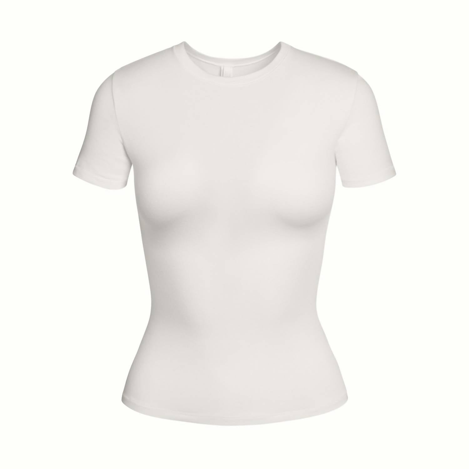 This classic, short sleeve tee will be your go-to staple this season and beyond. Unparalleled comfort and style crafted with short sleeves in a fitted crew neckline design. Features pickstitch details along the sleeves and hem. Composed of 90% Cotton and 10% Elastane. Offering a stretchy, body-hugging fit that embraces your curves. Closure is a convenient pull-on style. For care, machine wash cold, do not bleach, tumble dry low, and cool iron as needed.