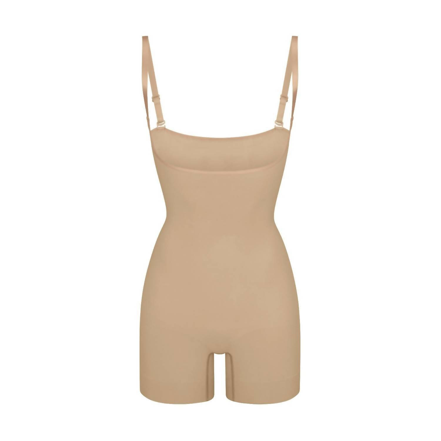 Experience flawless shaping with the Seamless Sculpt Open Bust Shortie Bodysuit by SKIMS in a sophisticated clay hue. Designed with spaghetti straps and made from 82% Nylon and 18% Elastane, this bodysuit offers adjustable straps and a high back for complete smoothing results. Closure: Pull on for ultimate ease. Care: Machine wash and line dry to maintain quality.
