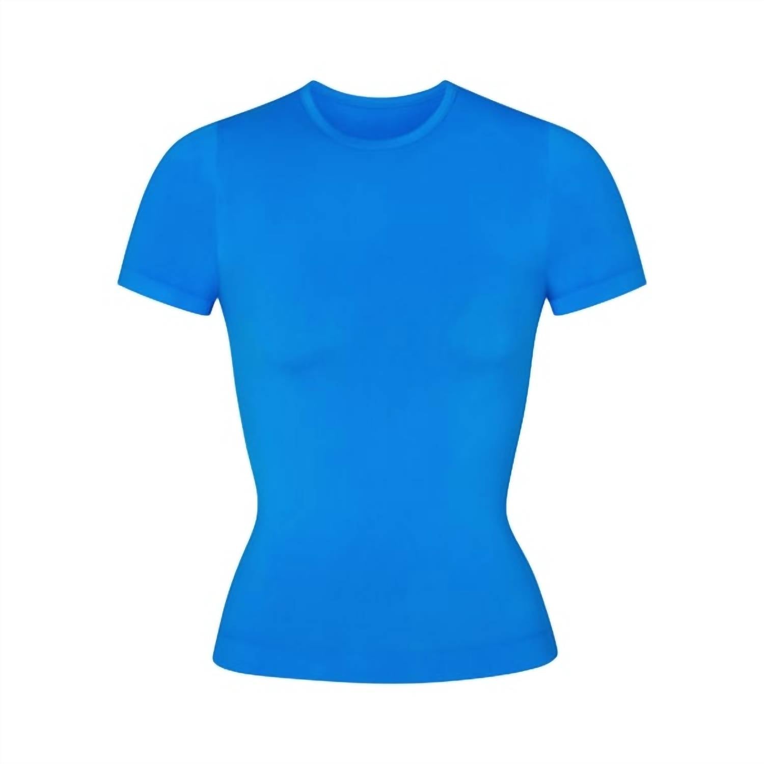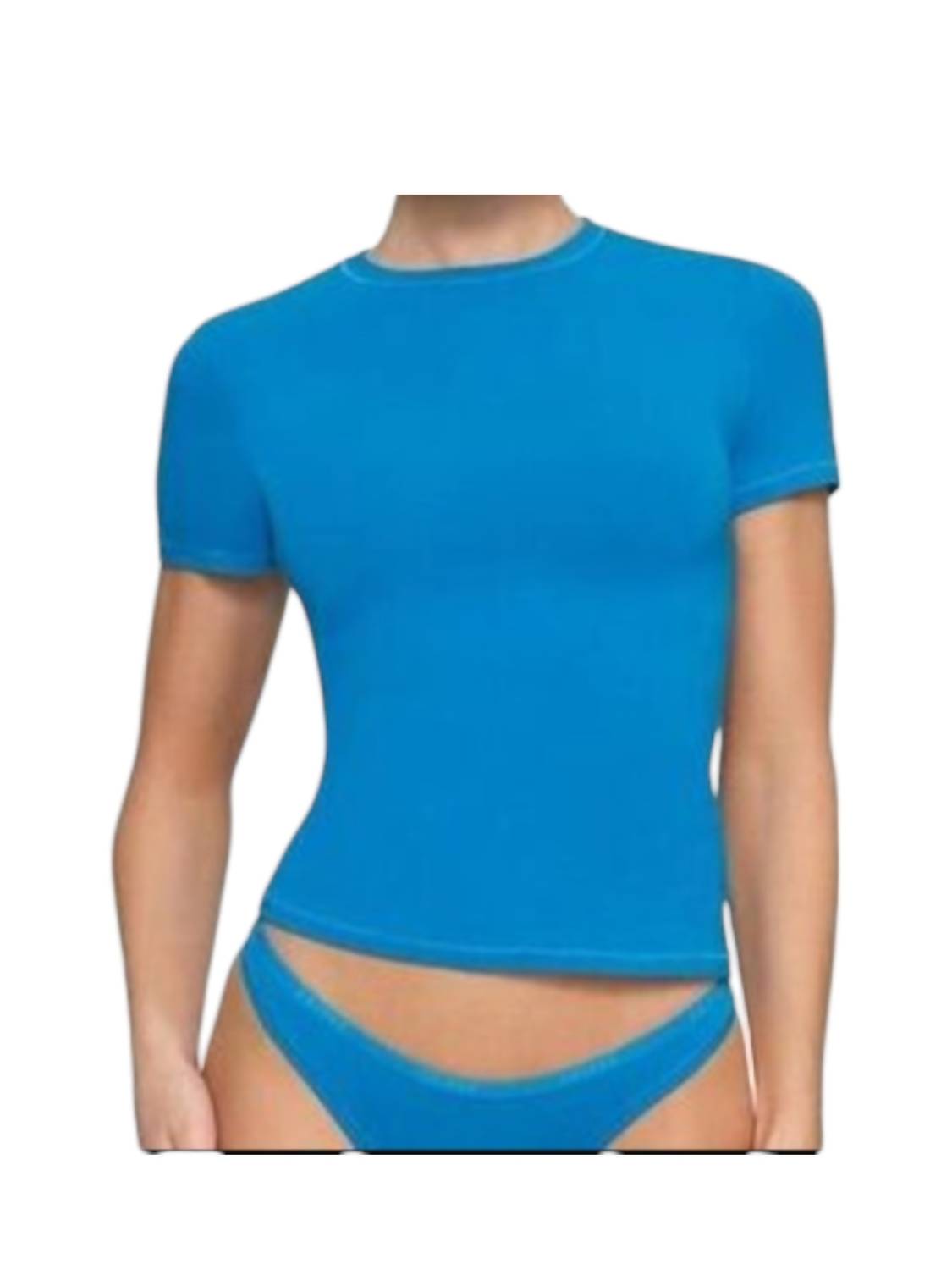 Look no further, you just found your perfect tee! Introducing the Soft Smoothing Seamless T-shirt by SKIMS, a perfect addition for those seeking comfort and style. Crafted from a luxurious cotton blend, this tee comes in a striking Azul Blute shade. Designed without closure, it ensures a seamless fit for effortless wear. Ideal for all-day comfort and easy pairings, making it a must-have in any wardrobe.