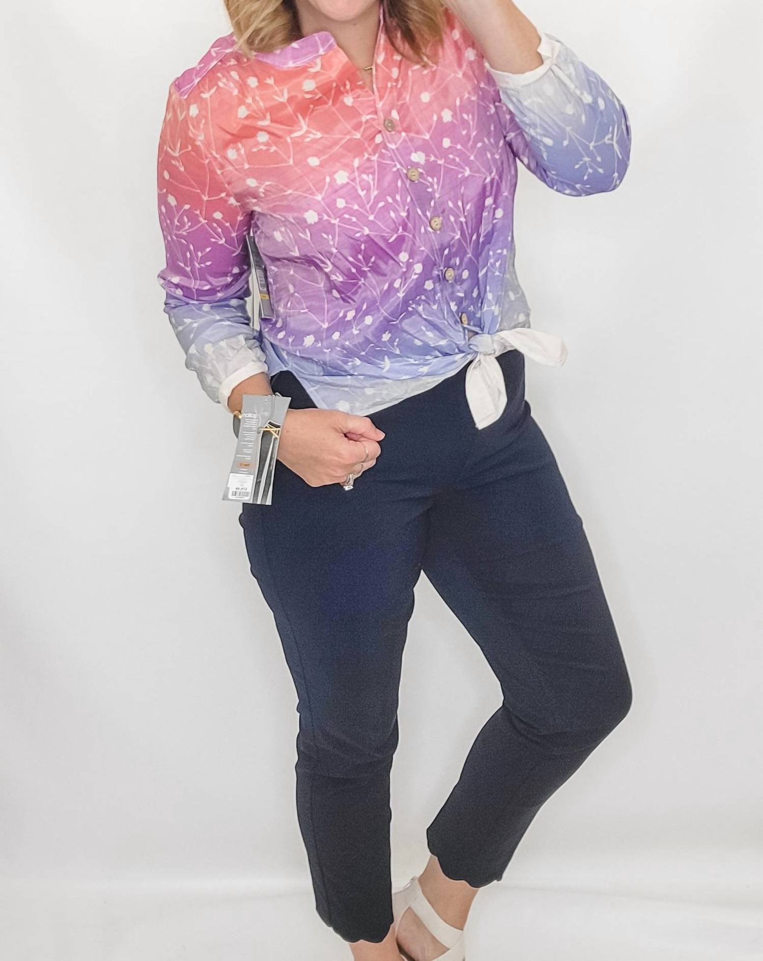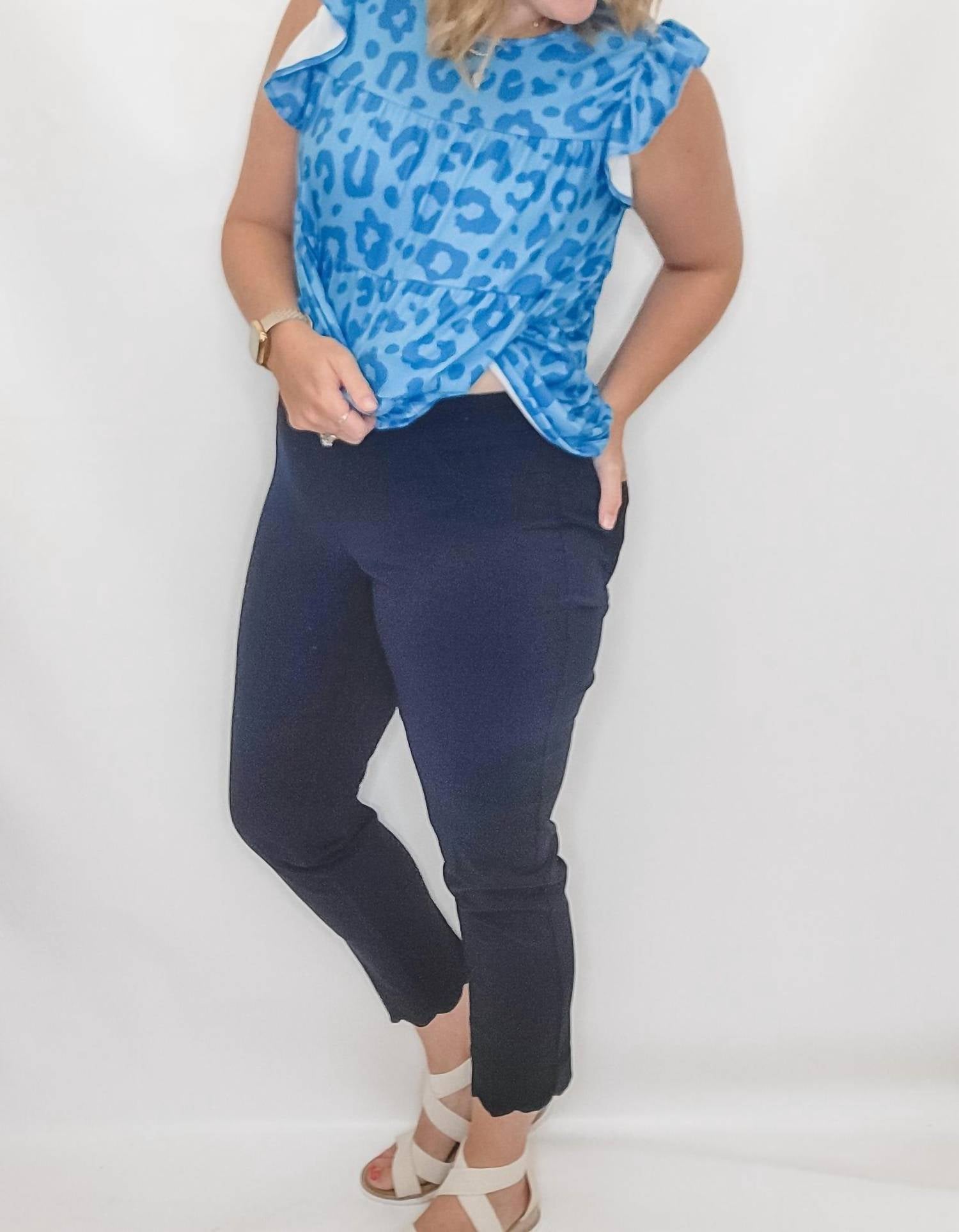 Enhance your wardrobe with this trendy cropped number, designed to blend style and practicality. The comfortable fit allows for easy all-day wear. The perfect length to pair with your favorite mules. Discover the Ankle Pant With Scalloped Hem by Slimsation By Multiples, an essential piece for every wardrobe. These pull-on, ankle-length pants in a classic Midnight color are designed to flatter with a flexible tummy control panel that smooths and slims. Crafted from a blend of 76% rayon, 21% nylon, and 3% spandex, they feature a shape recovery technology with faux front pockets and functional back pockets. Care is effortless with machine wash instructions. These pants promise a true-to-size fit.