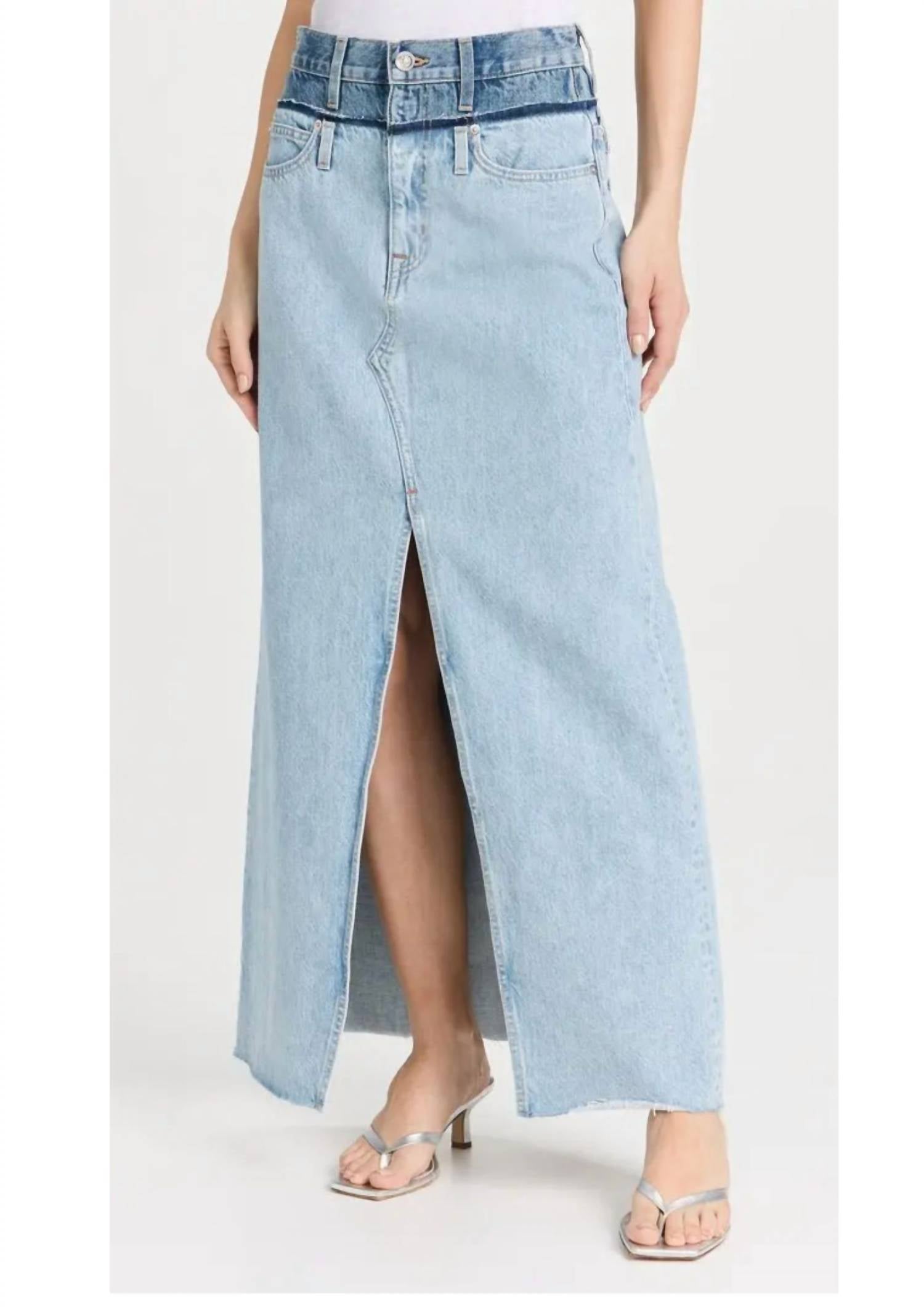Who doesn't love a good maxi skirt? Experience timeless elegance with the SLVRLAKE Re-work Dallas Double Waistband Skirt in Twin Valley. Crafted from heavyweight, non-stretch 100% cotton denim, this maxi skirt is designed with frayed trim at the waist and hem, a front slit, and practical 5-pocket styling. Accentuating the 90s fashion trend, it features a button closure and zip fly. Made in the USA with imported materials, this skirt measures 41 inches (104 cm) in length for size 24. Care: Machine wash cold, tumble dry.