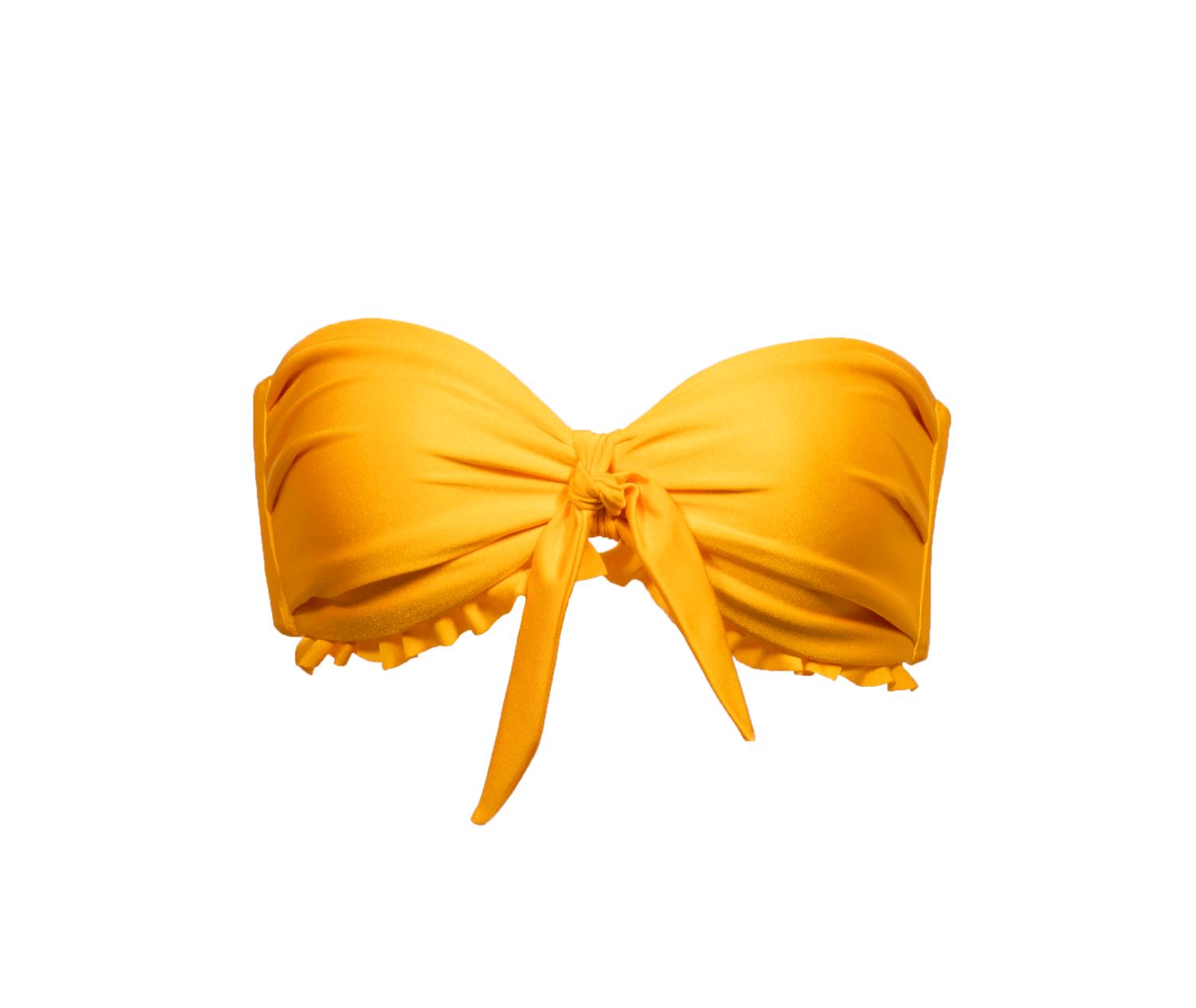 Ideal for relaxed poolside moments, this adorable swimsuit effortlessly transitions into the perfect sunset dinner outfit when paired with a flowing skirt. The Carmen Bikini Top by SOAH in vibrant yellow is an essential for your beach day wardrobe, offering a chic and seamless strapless design. Made in the USA, this top is crafted from a blend of nylon and spandex, fully lined for extra comfort and durability. Featuring a back golden clip closure with a removable knot tie and small ruffles at the bottom for a feminine touch. Take note that this item runs small, so size up for the perfect fit. Care: Hand wash cold. Model is wearing a size medium.