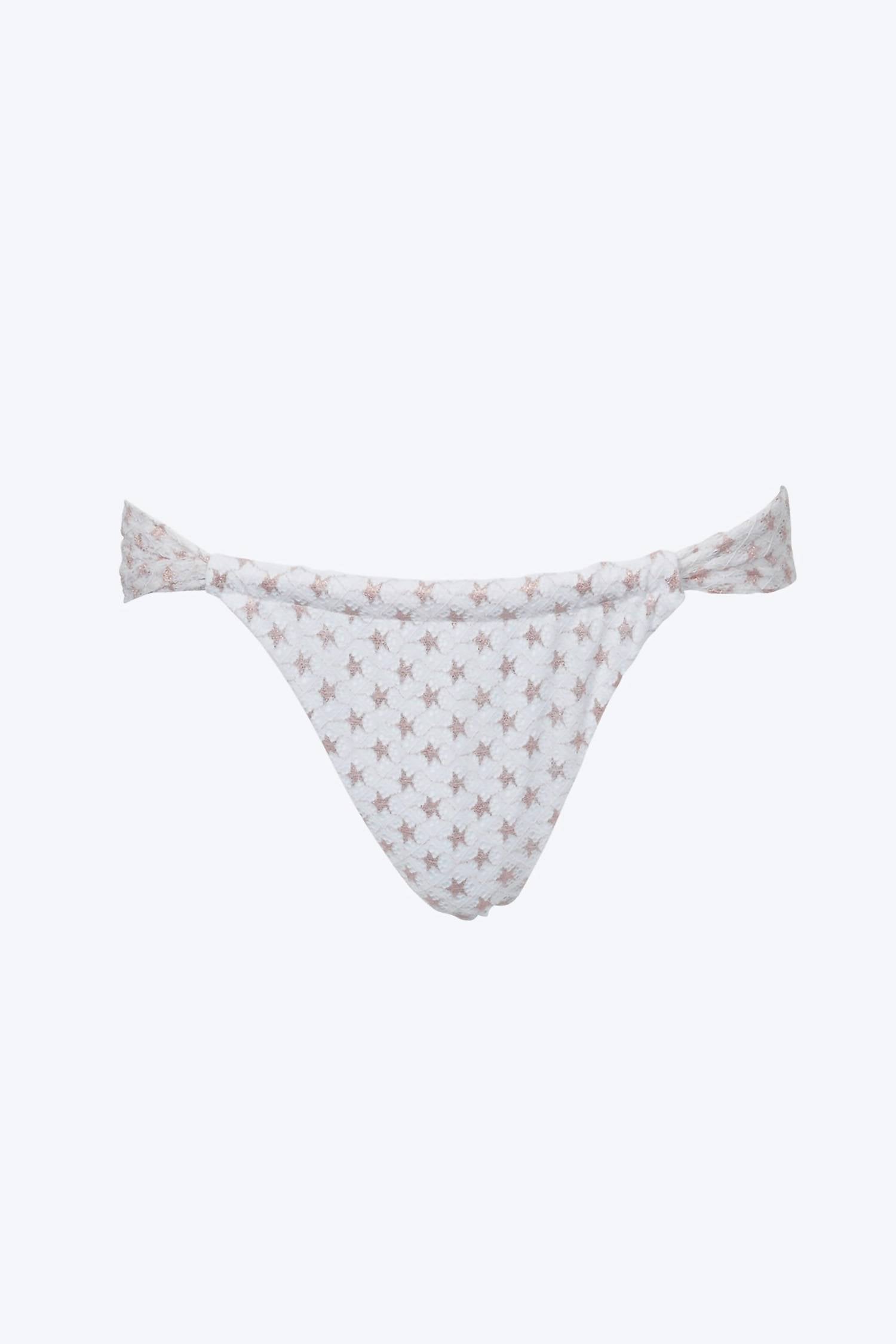 Dream of your next beach getaway in this cute little number. Pair with strappy sandals, a floppy hat, and an oversized tote to complete the perfect vacation look.Flirty and feminine, SOAH's 'Karma' bikini bottoms are made of stretchy lace that's fully lined and printed with dainty gold stars. They have a flattering ruched silhouette and the sides can be worn high on the legs or low on the hips. Coordinate yours with the matching 'Karma' top.This item is part of a matching setFabrication: 95% Polyester, 5% SpandexCare: Hand wash cold, lay flat to dryStandard Clothing Sizing