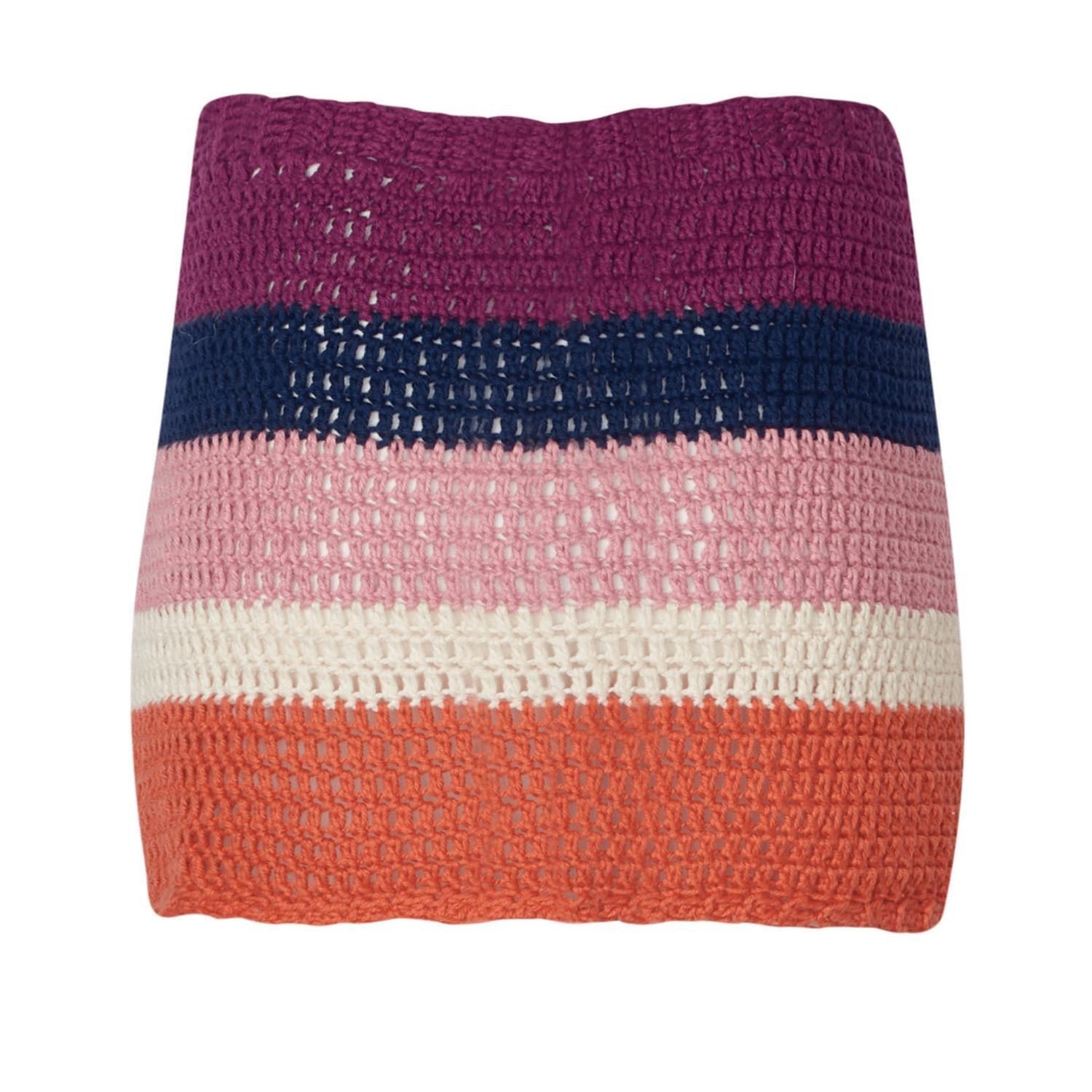 The Women's Kaia Crochet Mini Skirt by SOAH brings a bold, beach-ready vibe with its striking striped pattern. This sunset-colored mini skirt features a slim, high-rise silhouette and an adjustable waistband for a custom fit. Made without pockets or lining, it offers a carefree, lightweight feel perfect for summer beach days. Closure: Tie closure.
