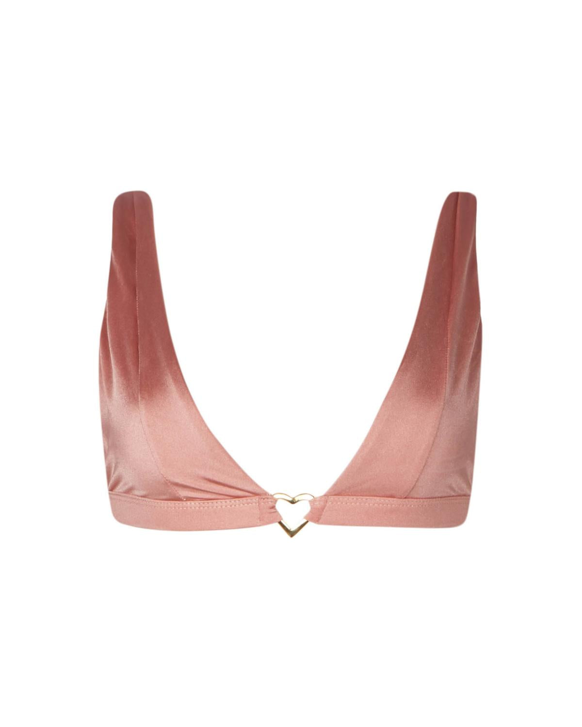 This cute and flattering swimsuit is perfect for making a splash at the pool, lounging on sun-kissed beaches, and staying stylish throughout the upcoming summer season. Introducing the Women's Love Triangle Bikini Top by SOAH, a sophisticated choice in Metallic Rose perfect for a sunny beach day. This solid bandeau swim top features an unpadded design with an elastic underband for added support and an adjustable open back for a secure, customizable fit. The golden heart detail adds a touch of elegance to the classic coverage style. This piece is best cared for by hand washing.