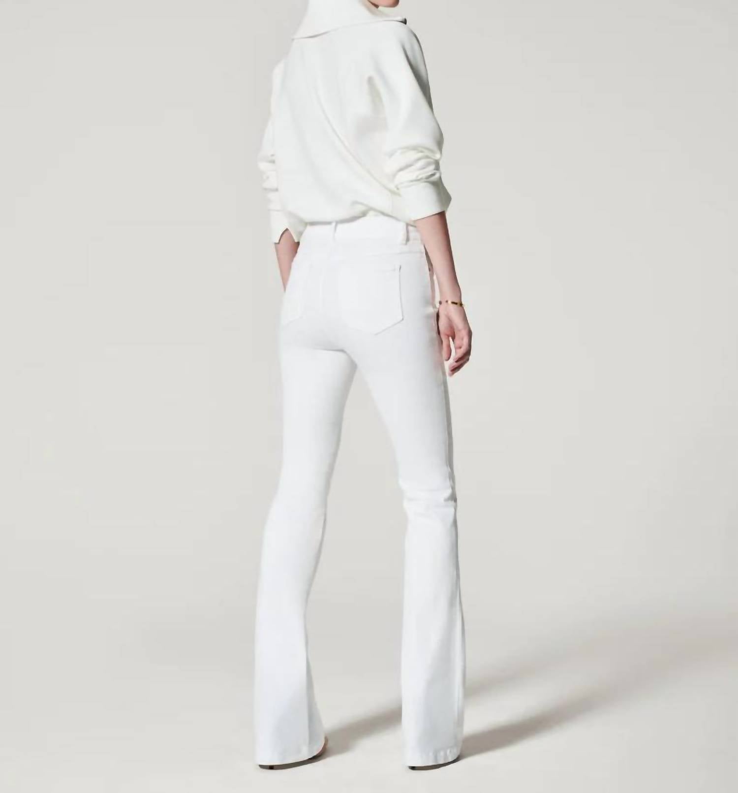 Experience superior comfort and style with the Spanx High-rise Flare Jeans in chic white, made from premium stretch denim. Designed with a flattering high-rise fit, these jeans boast a hidden core shaping technology for tummy control and lift. They feature a convenient pull-on style with no buttons or zippers, and offer a feminine flared leg silhouette. With functional back pockets, these jeans run long, so pair them with your favorite 3-4" heels for maximum impact.