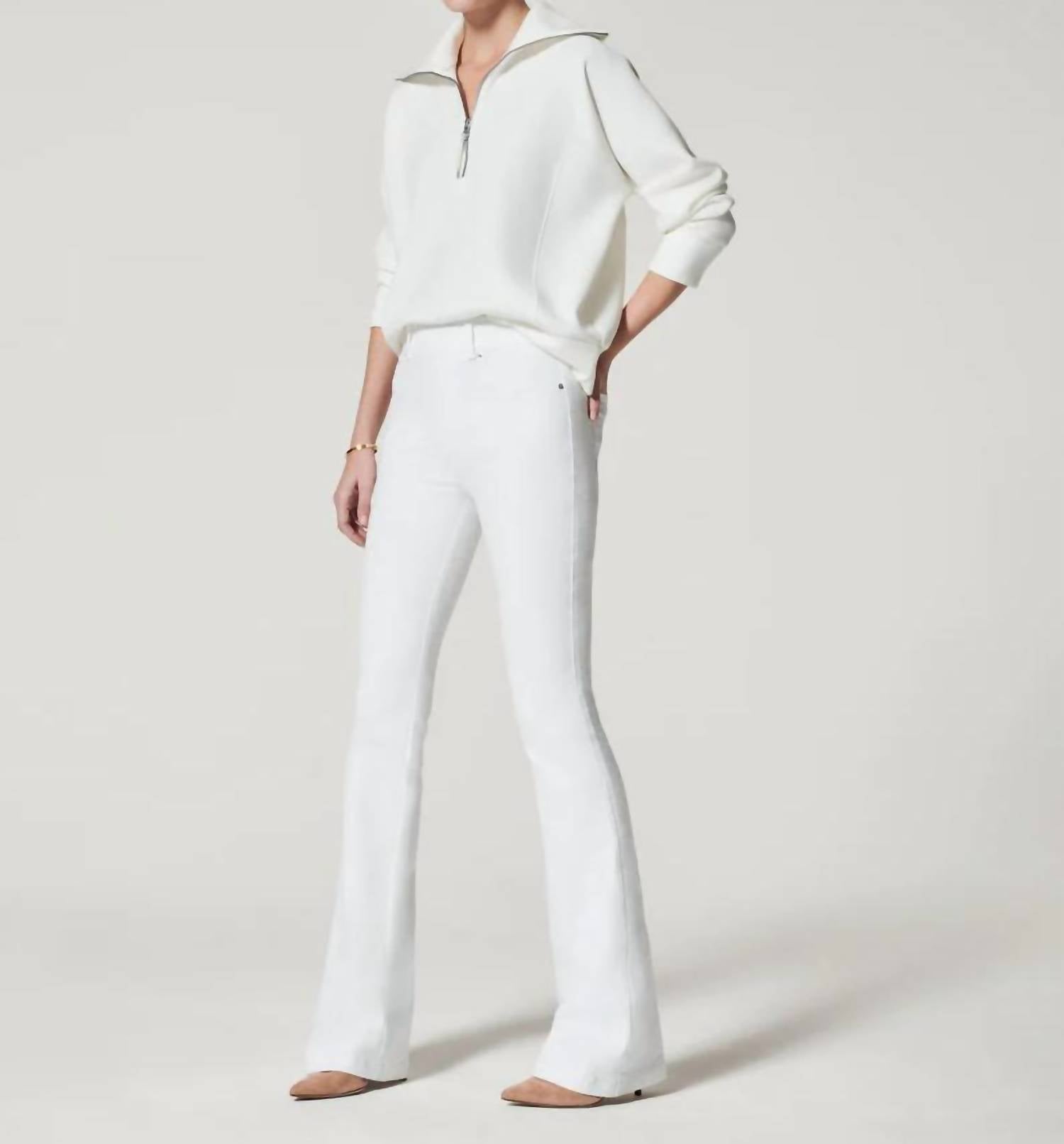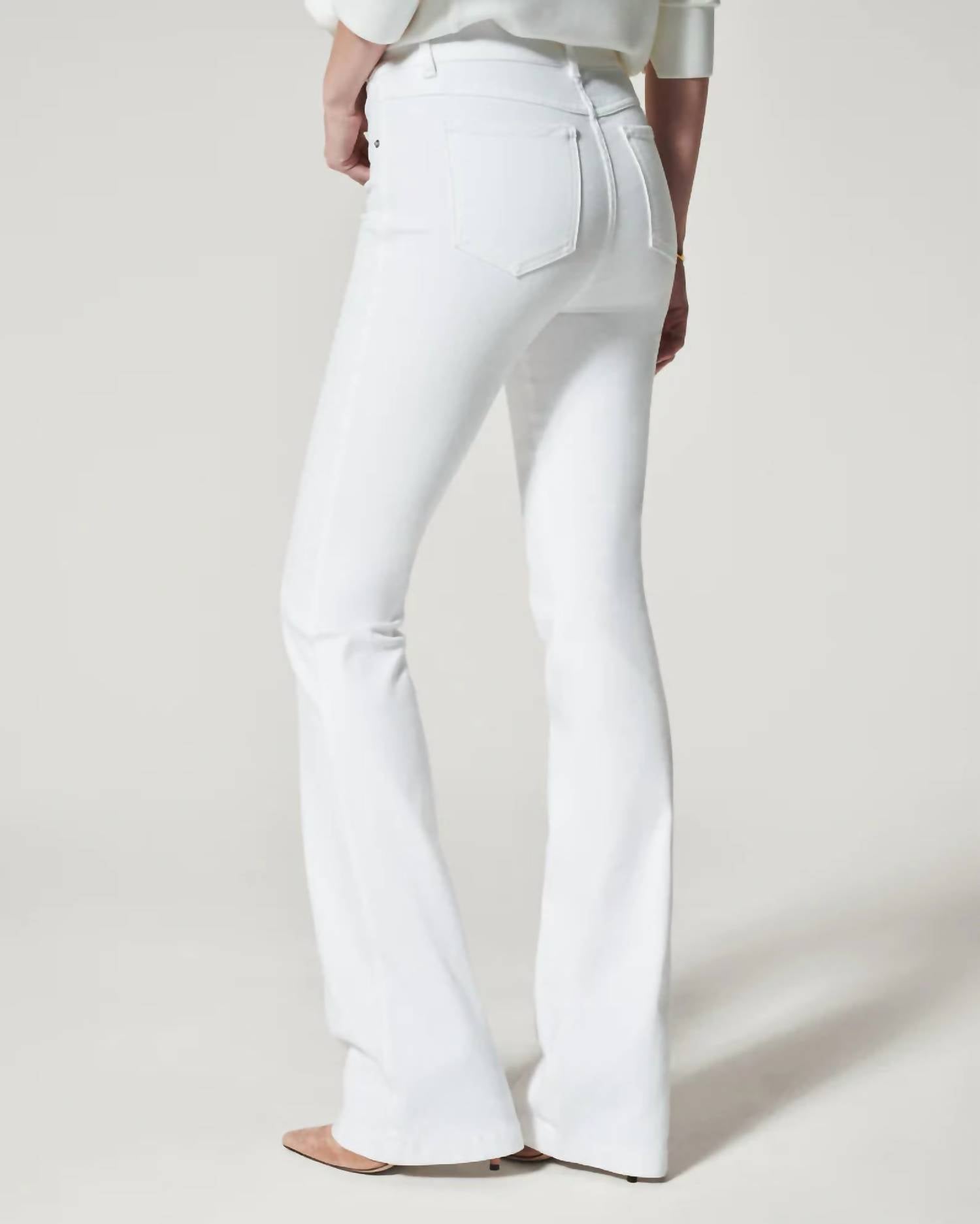 Pair these wide leg jeans with mules, slides or your favorite strappy sandals. Experience superior comfort and style with the Spanx High-rise Flare Jeans in chic white, made from premium stretch denim. Designed with a flattering high-rise fit, these jeans boast a hidden core shaping technology for tummy control and lift. They feature a convenient pull-on style with no buttons or zippers, and offer a feminine flared leg silhouette. With functional back pockets, these jeans run long, so pair them with your favorite 3-4" heels for maximum impact.
