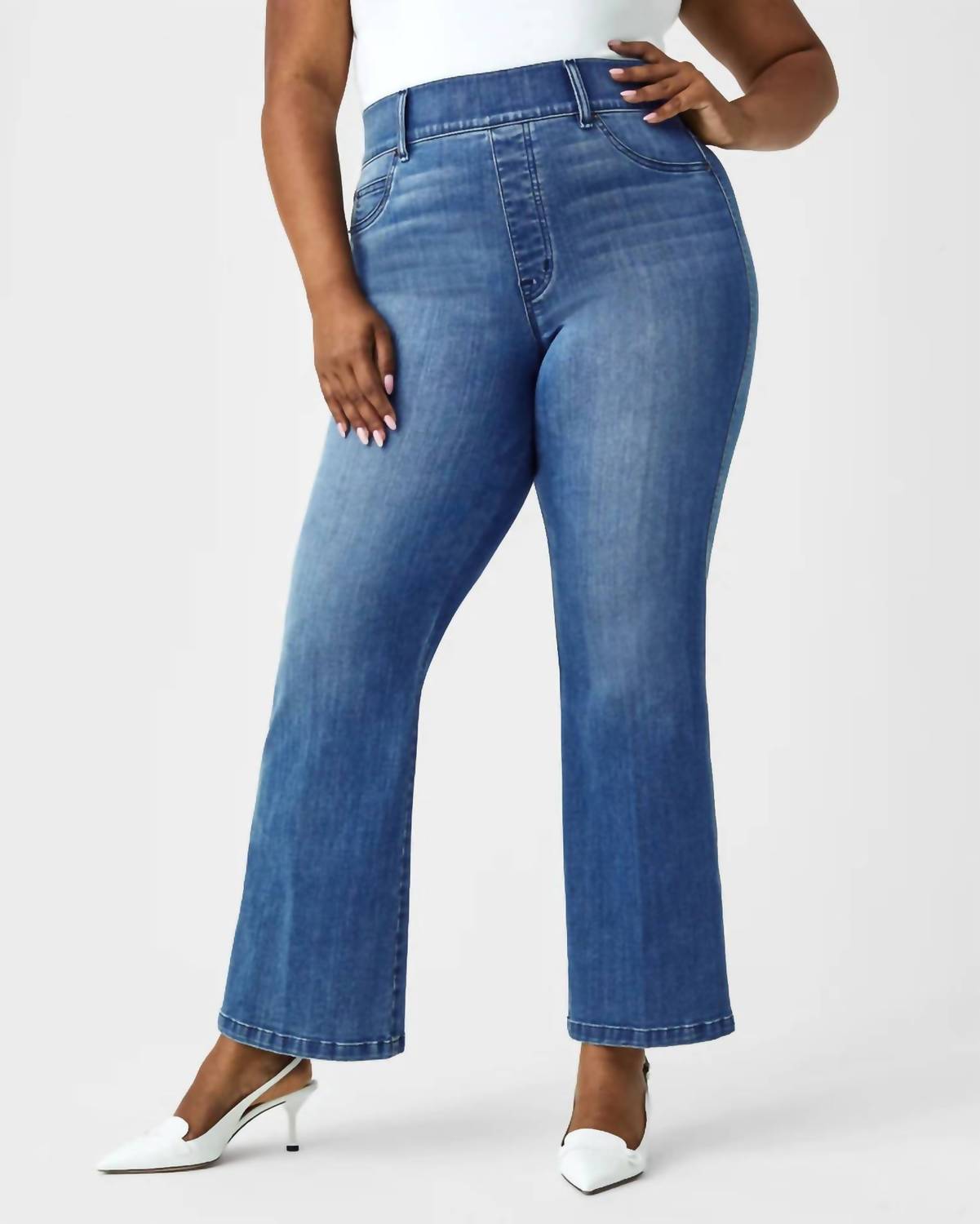 Just as cute as they are comfortable. These high-rise jeans boast a flattering kick flare leg and are crafted from a premium stretch cotton blend, designed for a comfort fit. With hidden core shaping technology and booty-lifting design, they deliver a flawless silhouette. Featuring functional back pockets, these jeans are made from 91% cotton, 7% polyester, 2% Lycra® elastane and lined with 70% polyester, 30% cotton, all in a pull-on design for hassle-free wear.