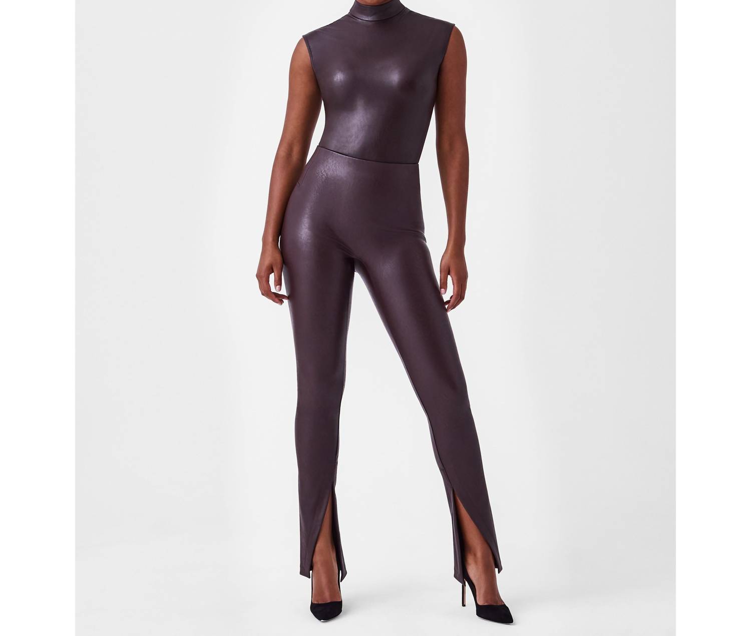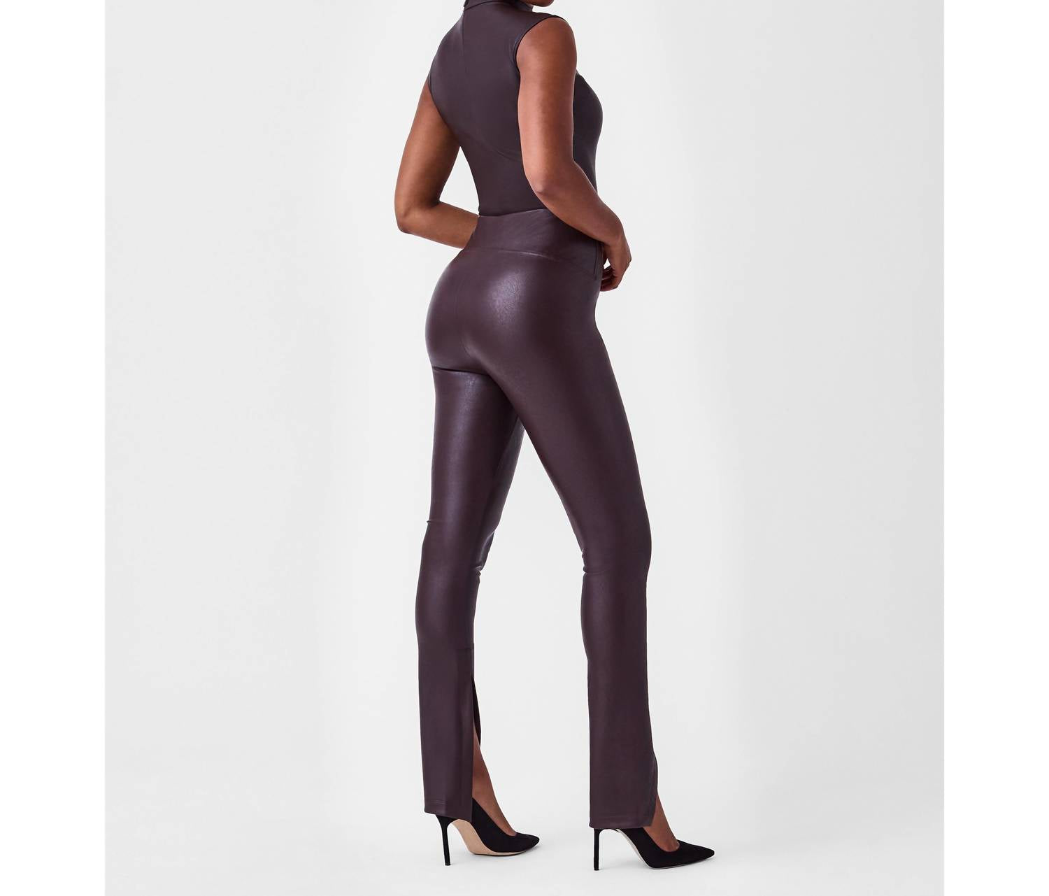 You'll be reaching for this best-selling legging all season long. Experience ultimate comfort and style with the Spanx Leather Like Front Slit Leggings in a stunning Cherry Chocolate shade. Designed for flexibility, these leggings boast a high-rise, skinny leg style with no waistband, providing a sleek silhouette. Made from 92% polyester and 8% elastane with a polyurethane coating, they offer a real leather look with the comfort of fabric. These pull-on leggings are imported and machine washable on a gentle cycle, ensuring easy care without the need for dry cleaning.