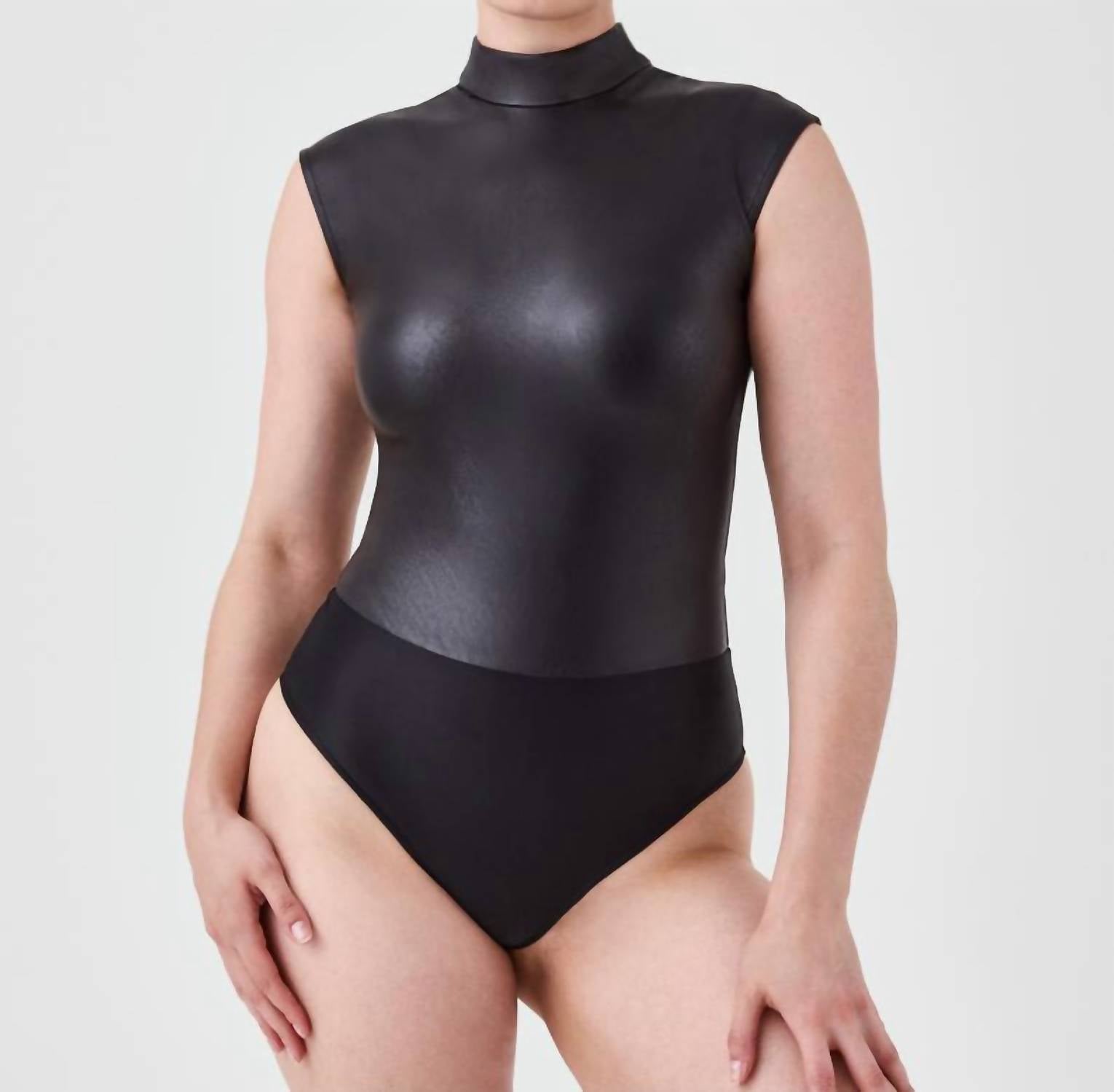 Who doesn't love a good bodysuit? Looks like leather, but flexes like fabric. This bodysuit features shaping, flexible fabric you can move in. Plus, it's machine washable. Flexible fabric you can move in without sacrificing the look of real leather. Shaping panty built-in for added lower tummy support. Designed for added shoulder and bra strap coverage. Comfortable snap closure. No need to dry clean.