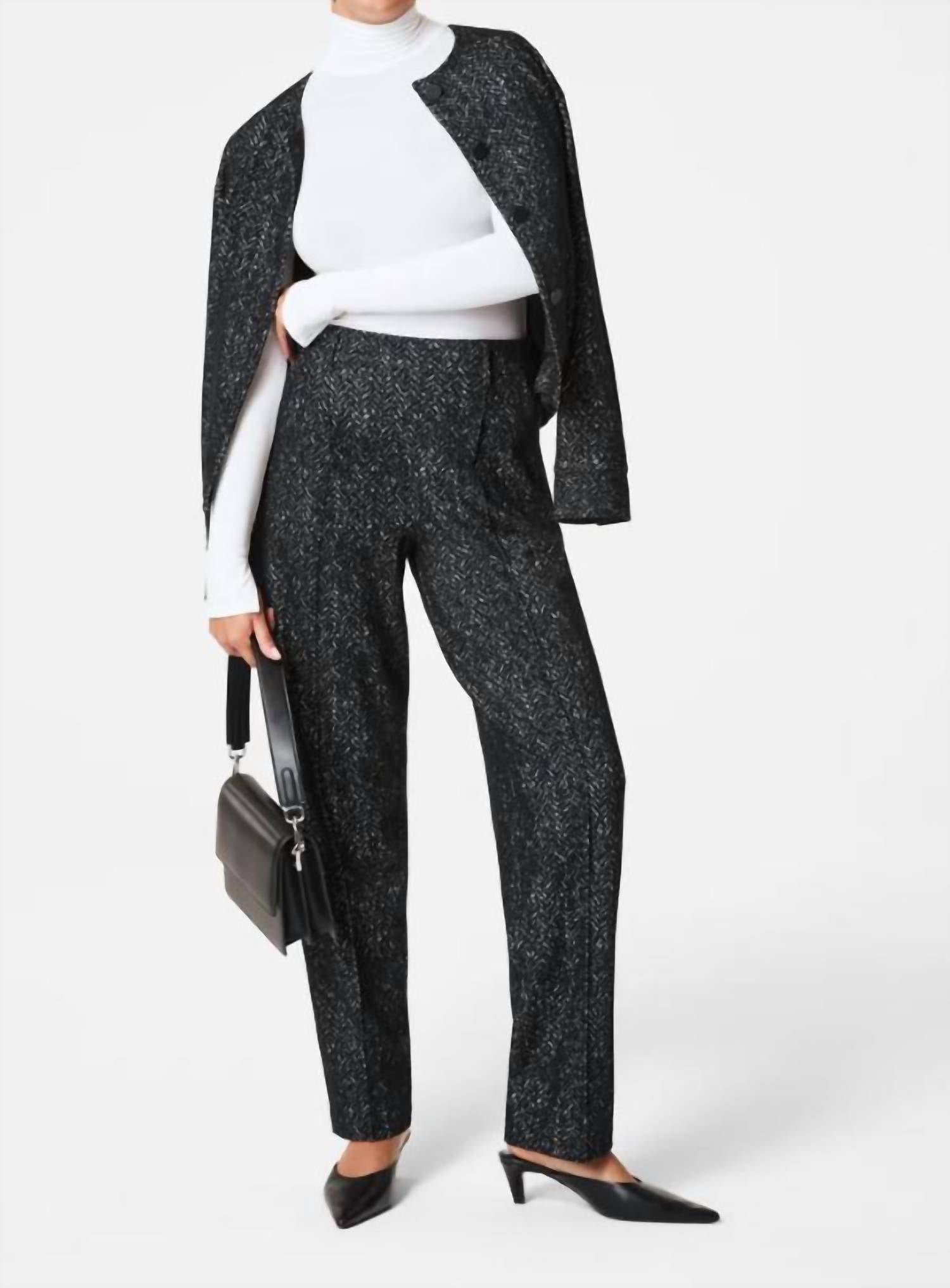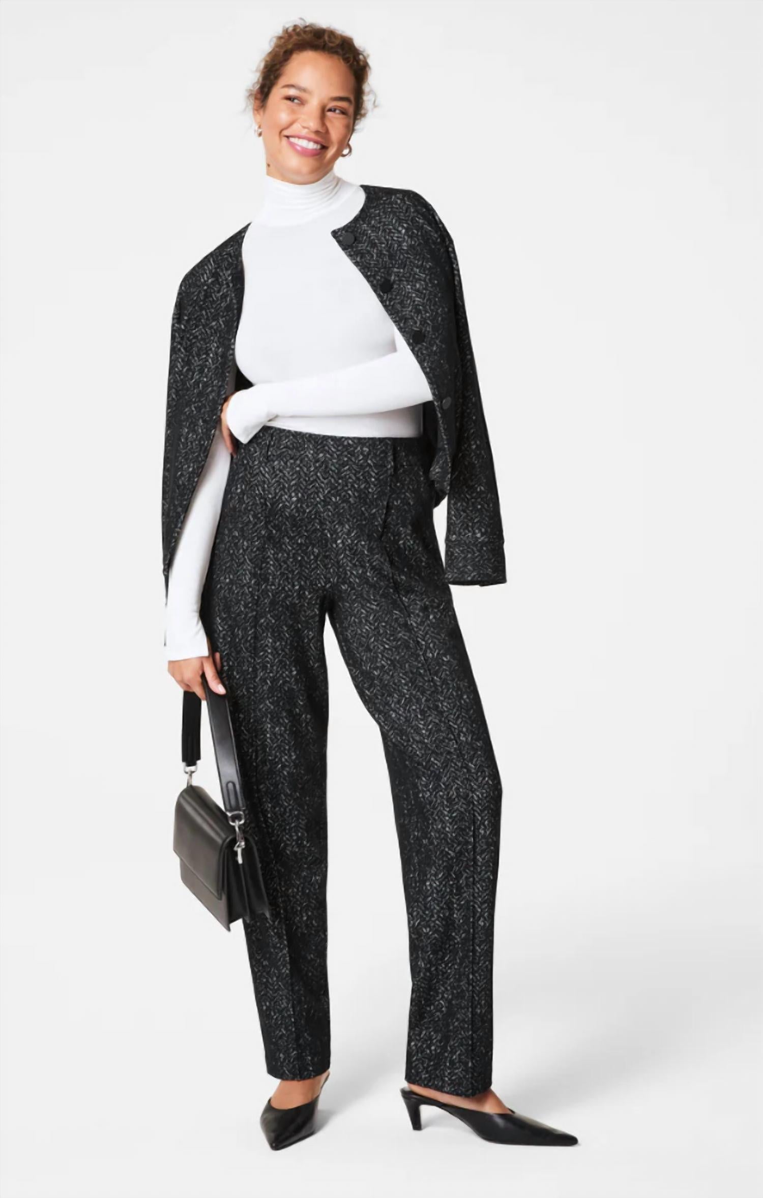 A perfectly tailored straight leg that you'll want in every color! Step into comfort and style. Made from premium ponte fabric. Feature a high-rise waist and boast a comfortable 4-way stretch for ease of movement. Composition: Body 57% Rayon, 38% Nylon, 5% Elastane. Pockets 88% Polyester, 12% Elastane. Patterned in a timeless black herringbone jacquard. Offer a relaxed fit through the leg. Pull-on closure for a sleek, bulk-free silhouette.