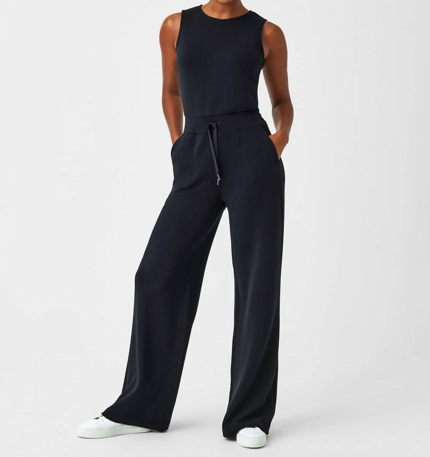 Throw it on and go! Introducing the Spanx Tank Jumpsuit, a minimalist summer essential in classic black. This women's jumpsuit features a solid pattern with sophisticated wide legs for a comfort fit. Crafted from lightweight Modal, it offers easy-moving stretch and includes functional pockets. Closure: Tie closure with a keyhole button detail. Care: Machine wash, tumble dry. Perfect for a dinner party or a Halloween gathering, Shaina is wearing a size small.