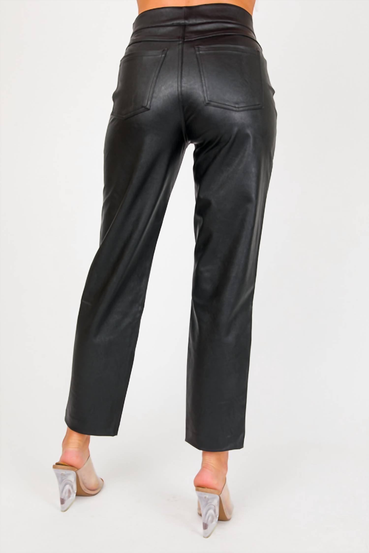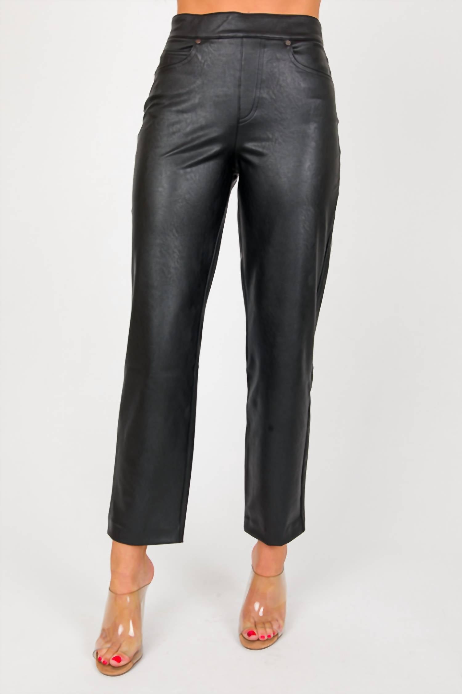 Upgrade your wardrobe with these cropped pants, designed to merge sophistication and wearability. The tailored fit ensures ultimate comfort during long days or nights out. Experience the Slim Straight Pull On Pant by Spanx in Luxe Black, crafted to combine the sleek look of faux leather with unparalleled comfort. Designed with a high rise and straight leg, this ankle-length pant offers a flattering fit thanks to its hidden core shaping technology. Made of 92% polyester and 8% elastane with a polyurethane coating, and lined with 80% polyester and 20% elastane, it offers flexibility and ease of movement. Closure is a simple pull-on, and it's machine washable with lay flat to dry instructions for easy care.