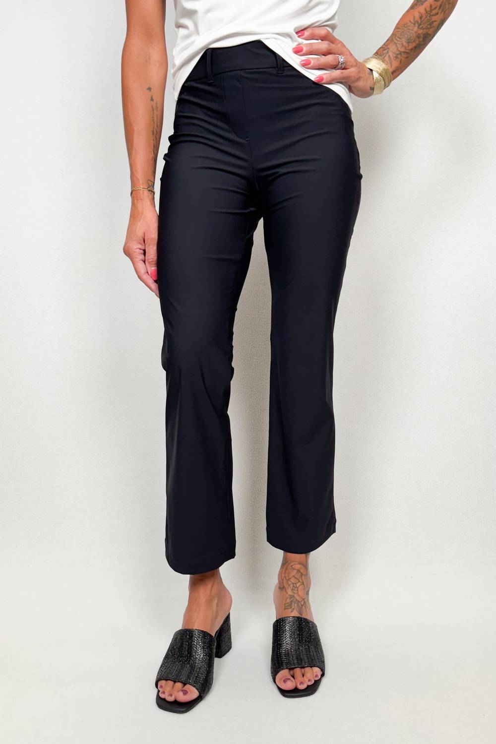 Pair these wide leg jeans with mules, slides or your favorite strappy sandals. Introducing the Spanx Sunshine Kick Flare Pant in Very Black, a must-have for any wardrobe. Designed with a flared leg and functional belt loops, these solid-color pants offer a flattering silhouette. Made from a 59% Nylon and 41% Elastane blend, they provide a comfortable and stretchy fit.