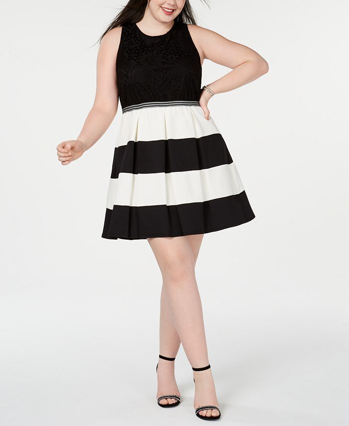 Strike a serious pose in this plus size fit & flare dress from Speechless| designed with a gorgeous lace bodice and bold stripes at the skirt.| Approx. 35-1/4 long from center back neck to hem. Length is based on size 16 and varies 1/2 between sizes| Scoop neckline; Fit & flare silhouette| Back zipper closure| Lace at bodice; contrast trim at waist; stripes at skirt