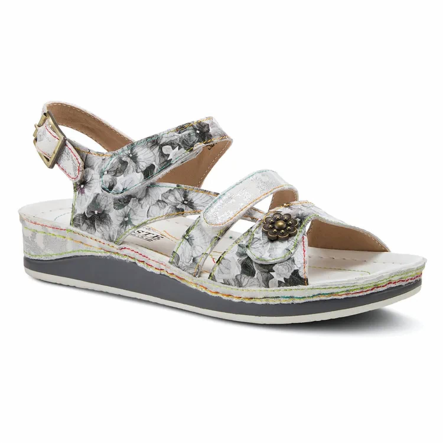 Flowy dresses, cropped pants, and even jumpsuits... this sandal works with them all! French inspired design, hand painted leather sandal featuring unique color blocking and fashioned with a metal flower button. Heel Height (approximately): 1 1/2", Platform Height: 1" Hand painted leather, contrast stitch detailing, antiqued gold hardware, floral embossed design, leather pieced wedge Hook-and-loop adjustable straps and an adjustable buckled strap at the heel Synthetic leather lining Synthetic leather padded insole Polyurethane outsole