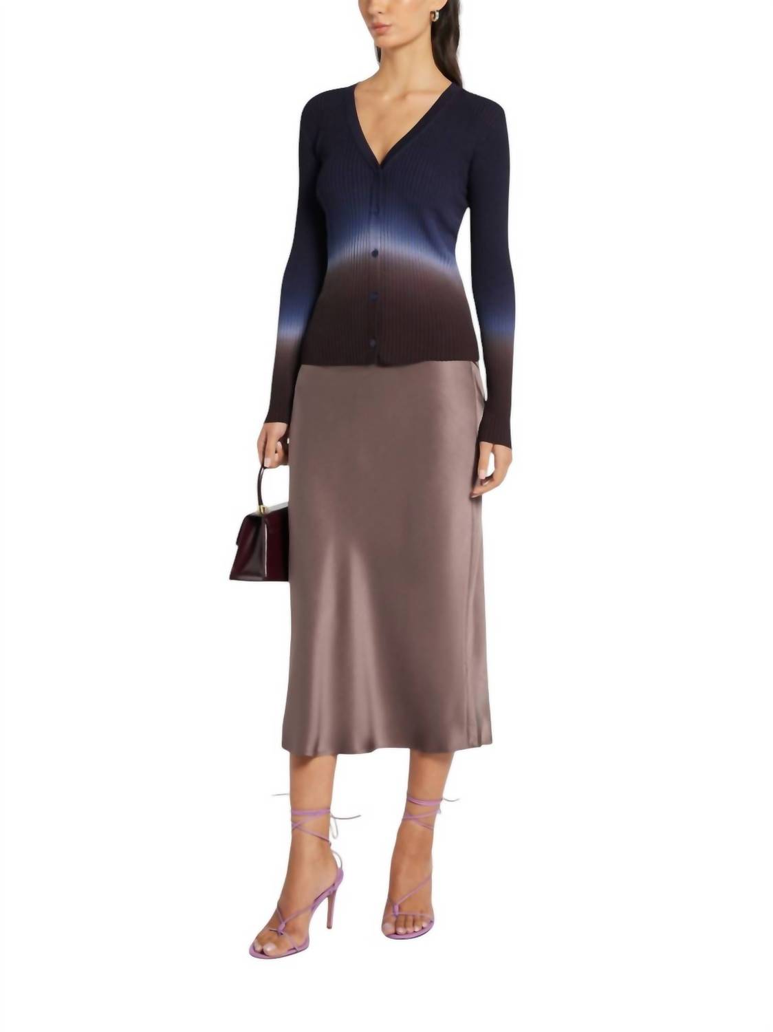 A timeless v-neck sweater that works season after season. Elevate your wardrobe with the Cargo Sweater by STAUD, a perfect blend of style and comfort. This V-neck long sleeve sweater is crafted from a luxurious 65% Viscose and 35% Nylon composition and features a unique Twilight Dip Dye tie-dye pattern. The button closure adds a classic touch to this elegant piece. To maintain its beauty, this sweater requires dry cleaning only.