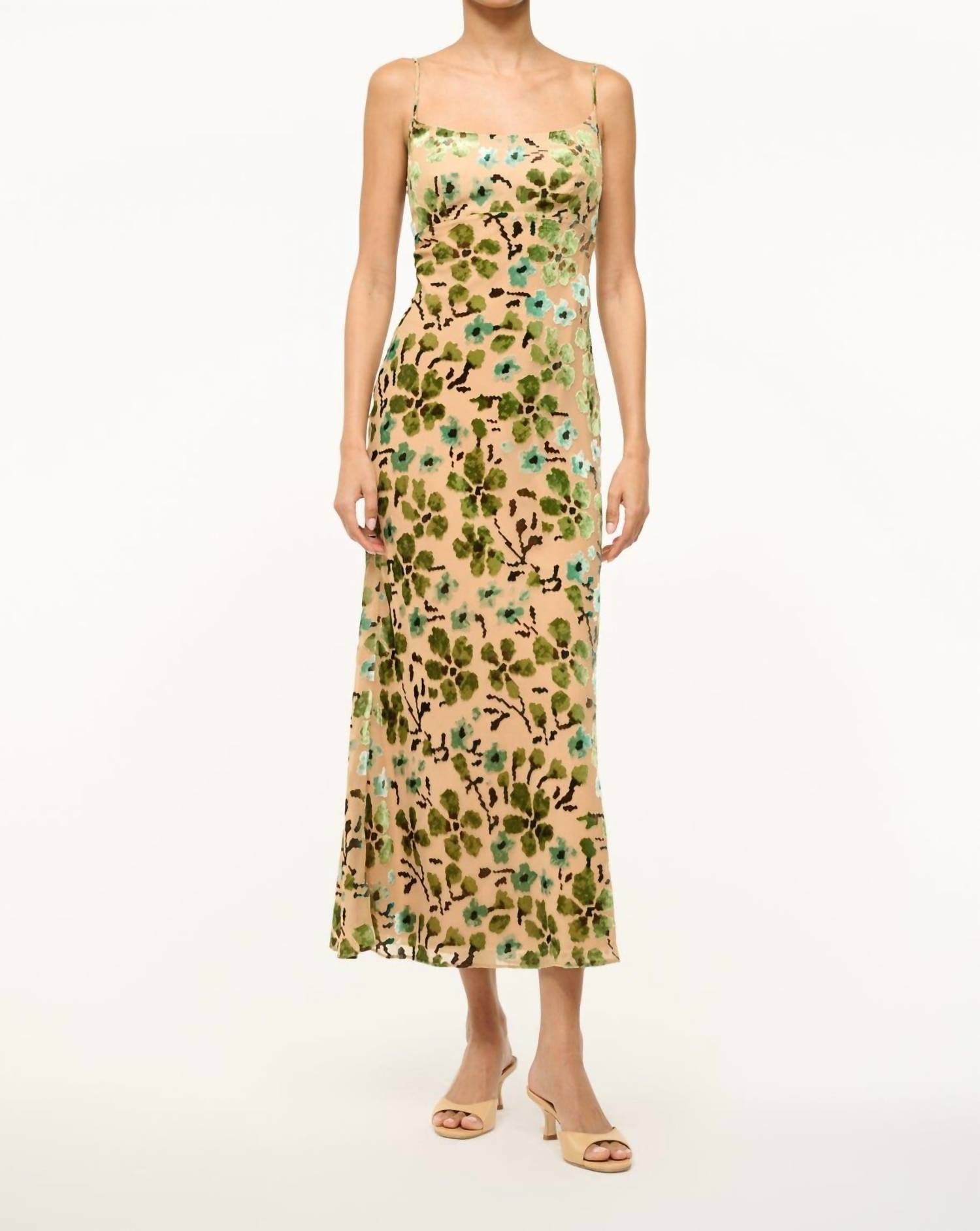 Just add slides or mules and you are good to go. Introducing the Dianna Midi Dress by STAUD in a stunning Moss Floral Tapestry. This sheath dress features delicate spaghetti straps and a scoop neckline, exuding an effortlessly feminine silhouette that is perfect for both vacations and special occasions. Made from a luxurious blend of 60% Viscose and 40% Nylon with a captivating floral burnout velvet design, it offers both timeless charm and modern elegance. Ideal for the spring season with its gentle, flowing silhouette, the dress combines a slightly fitted bodice with a gentle flare at the skirt.