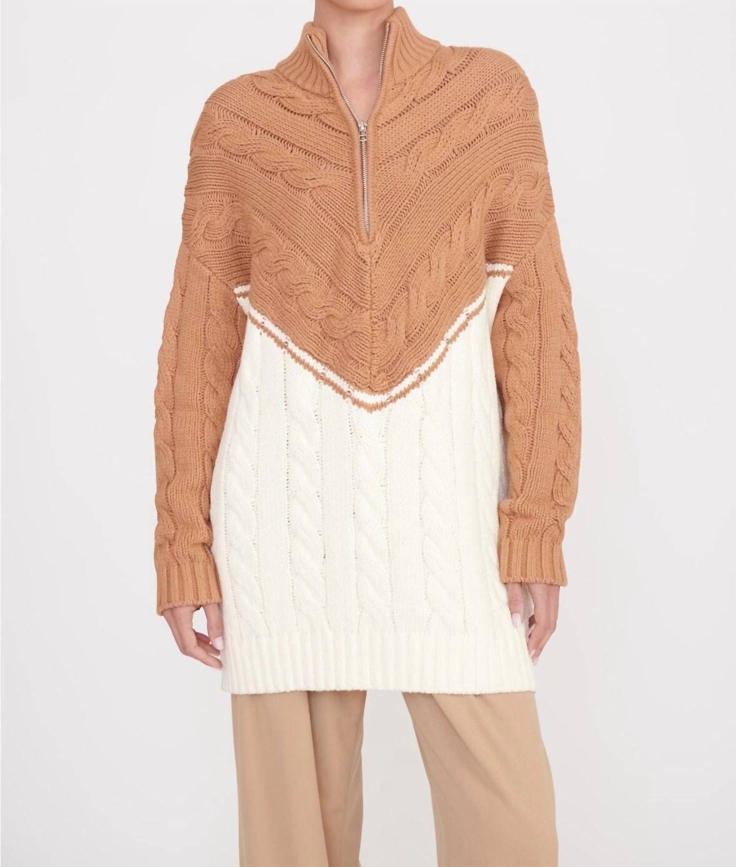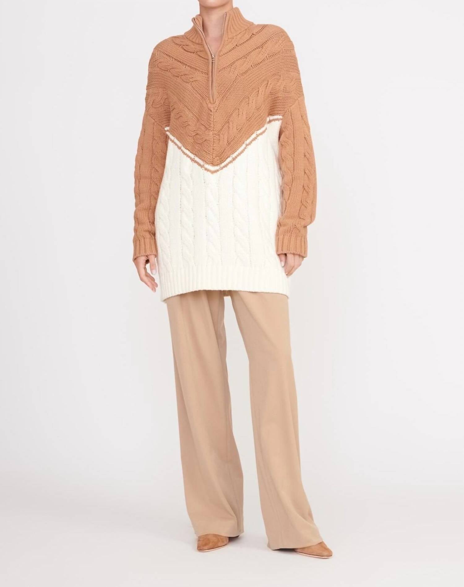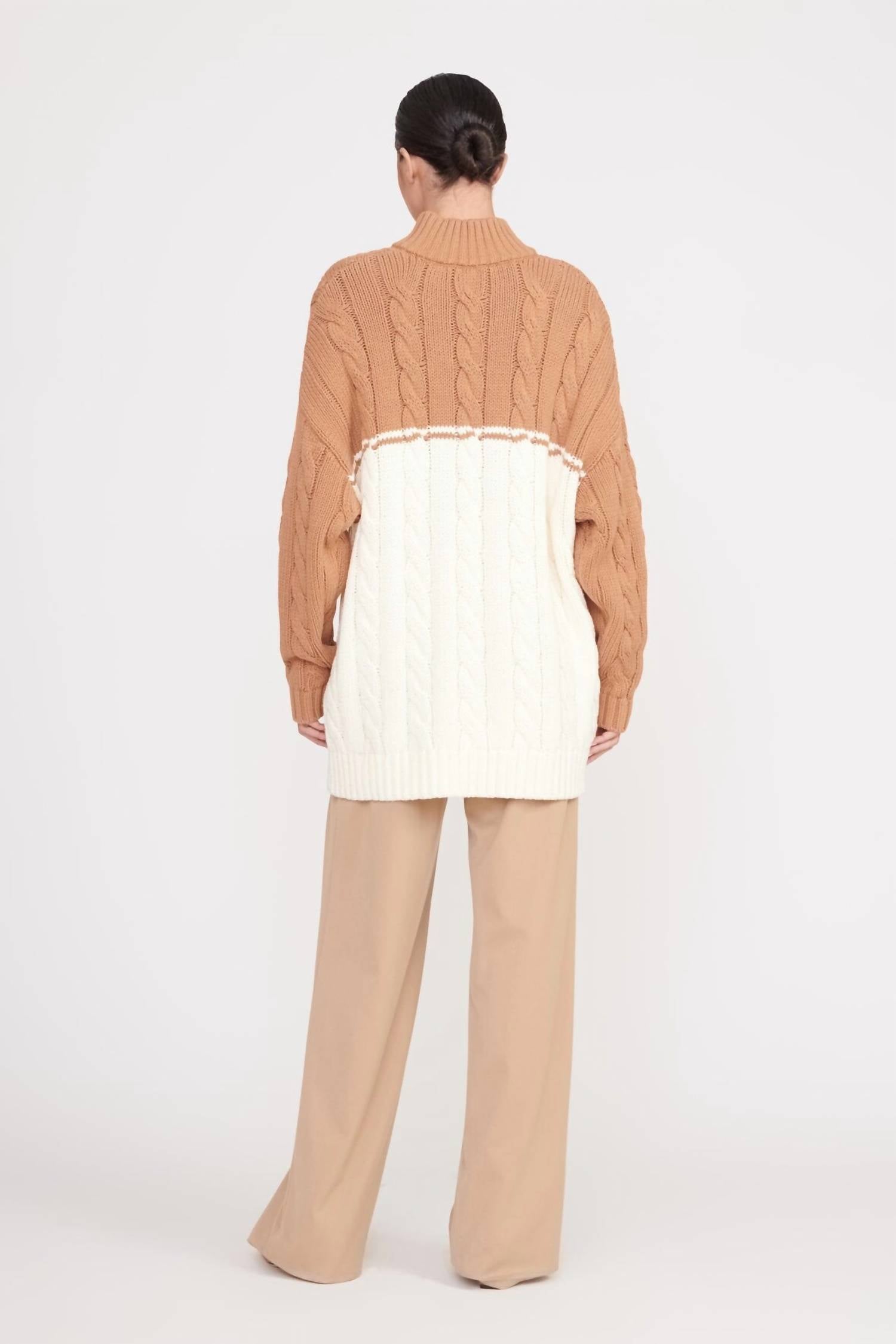 A classic staple that every closet needs.Signature oversized boyfriend sweater with contrast whipstitch detailing. Features a half zip and mixed knit patterns. Fabric: 60% Cotton, 40% Acrylic. Dry Clean Only. Model is 5'10" and wearing a size Small.