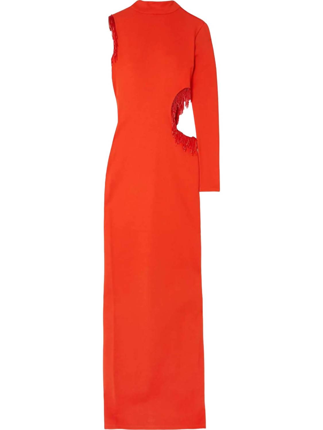 Perfectly tailored and fit to perfection.Stunning piece designed to make a statement. Crafted from luxurious 100% rayon. Impeccable drape and silky finish. Bold Fire Red hue. High neckline and single long sleeve. Asymmetrical twist. Flatters and elongates your frame. Featuring a discreet zipper closure and center back slit. Requires dry cleaning to maintain its pristine condition.