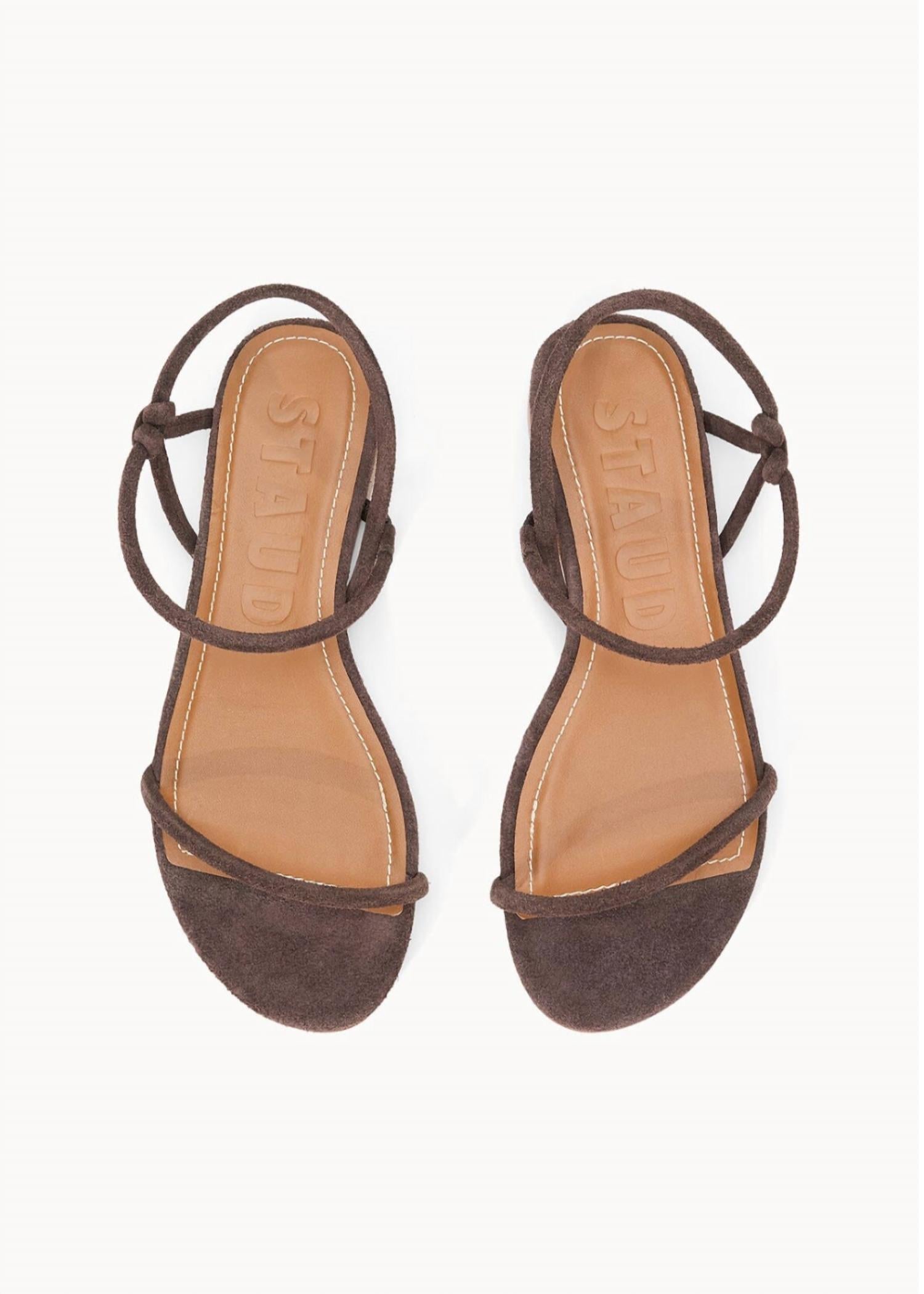 This sandal will take you from brunch to dinner and everything in between. Introducing the Women's Laurel Strappy Sandal by STAUD in a rich Mahogany hue, perfect for an effortlessly chic summer look. These sandals feature stylish rounded straps and a suede cord for both the toe and ankle, providing a comfortable and secure fit. Made from high-quality materials with the upper comprising 100% cow leather and the sole containing 75% cow leather and 25% rubber, these sandals are ideal for travel or casual summer events. With an open toe and flat heel style, you'll be stepping out in comfort and style all summer long.