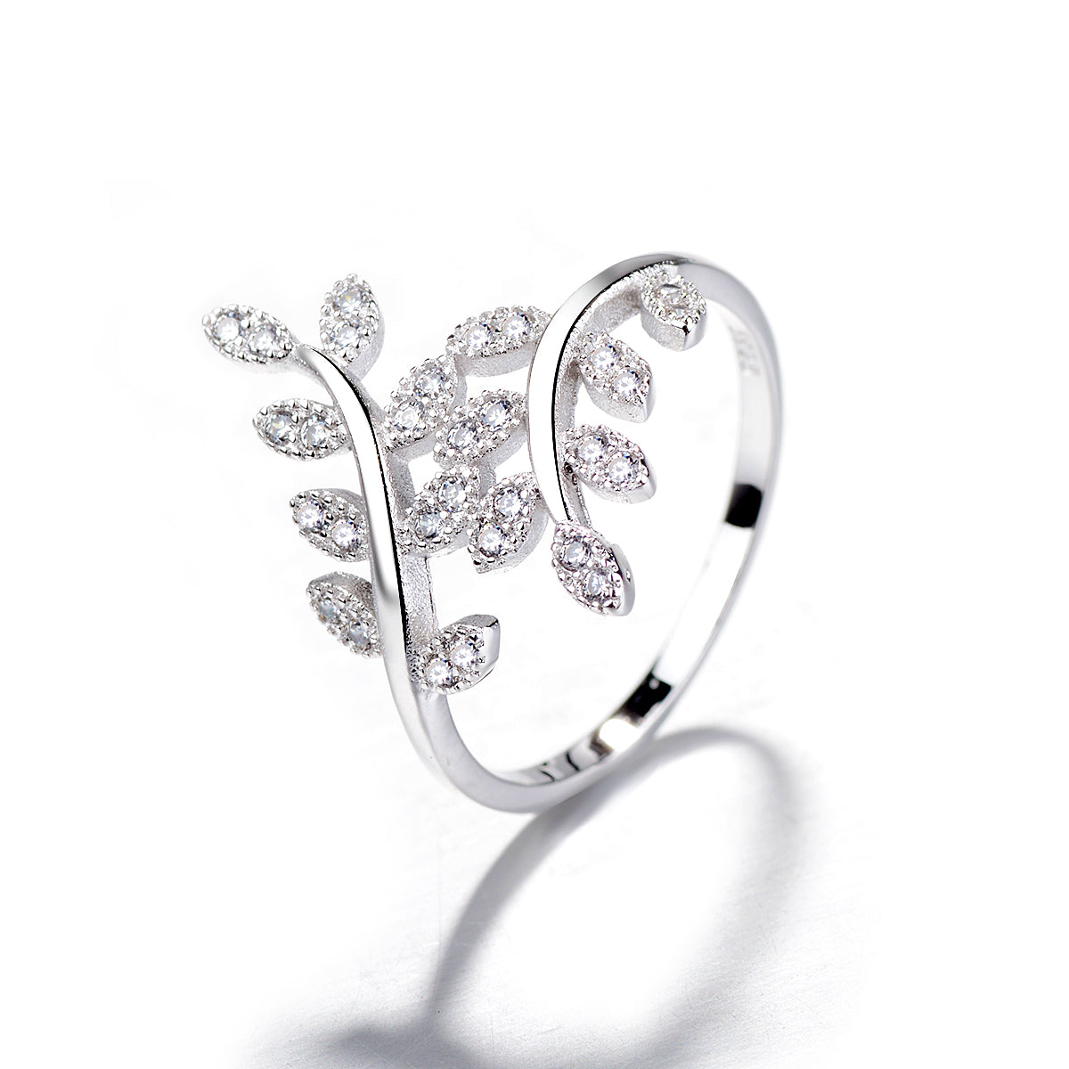 The ring's design is inspired by nature, with two delicate leaf-shaped ends that curve gracefully around the finger. The leaves are adorned with sparkling genuine crystals, which add a touch of glamour and sophistication to the piece.