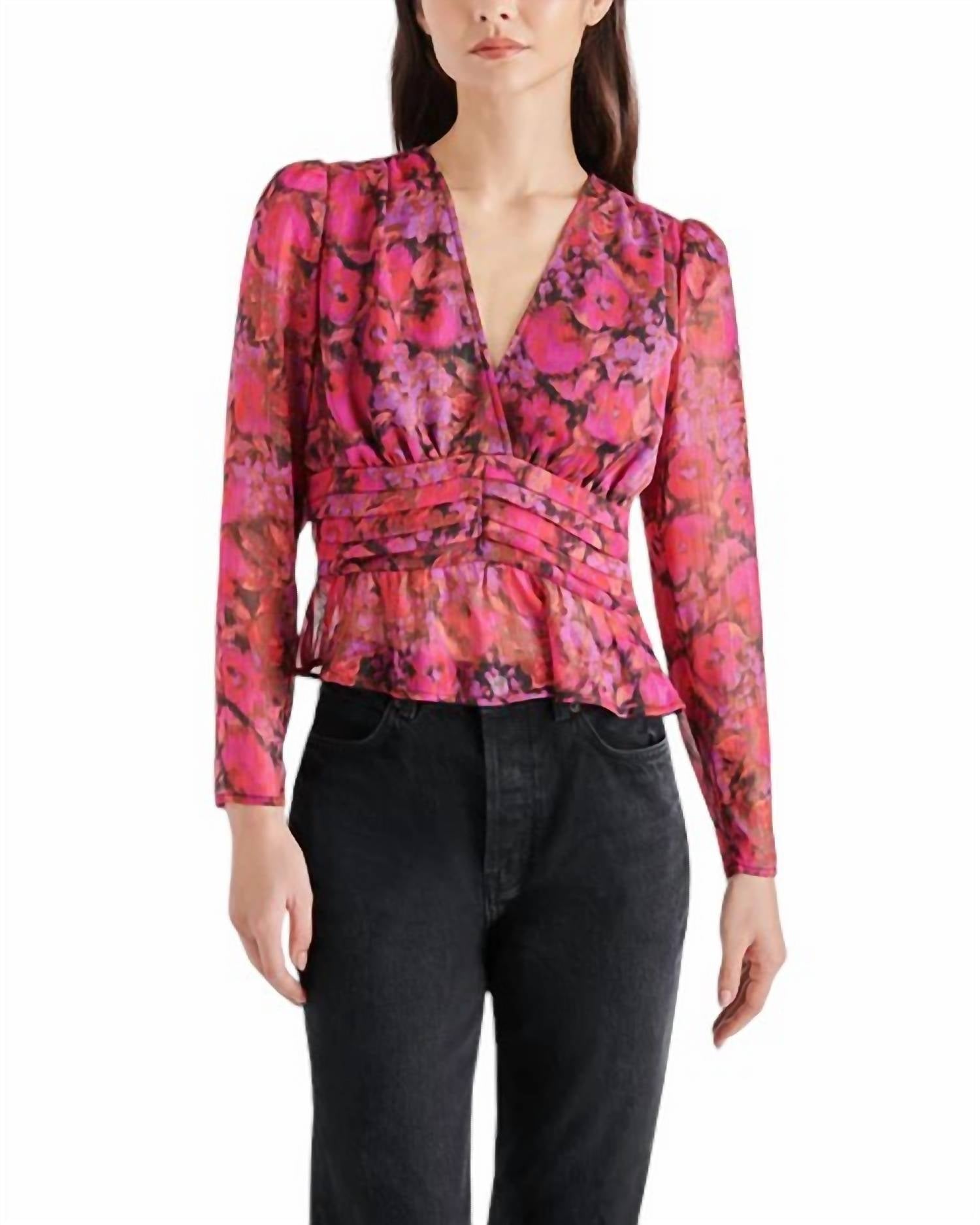 A timeless blouse that will never go out of style. Floral print peplum top featuring a V-neckline and long sleeves. Designed with a flowy fit and a peplum hemline for a flattering silhouette. 99% Polyester, 1% Metallic.