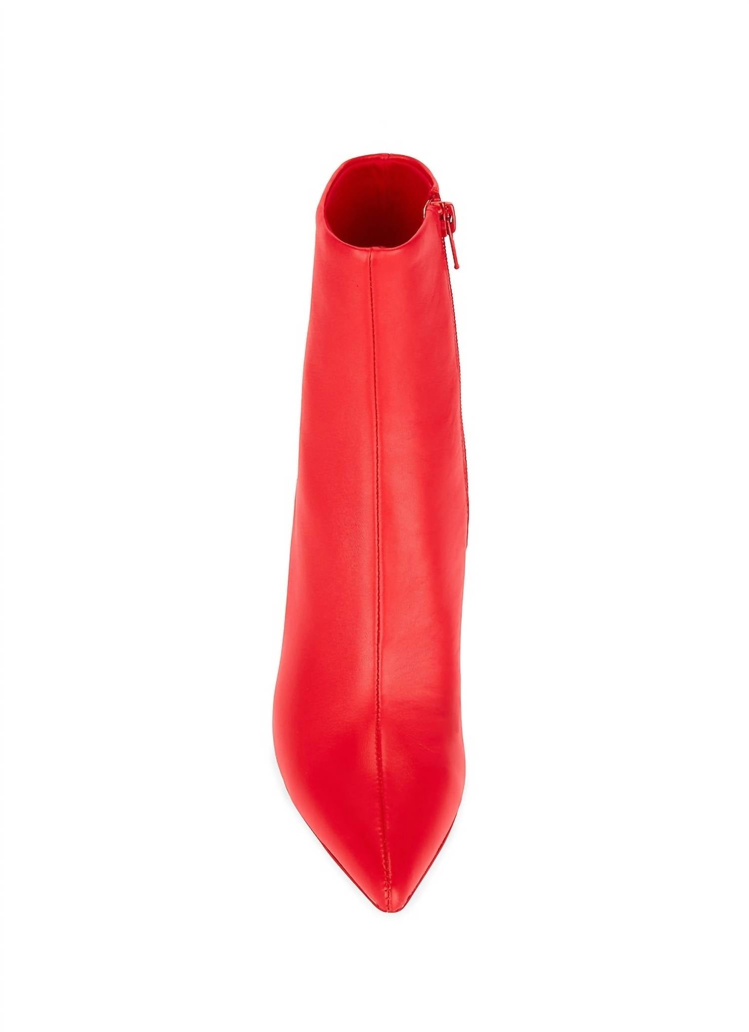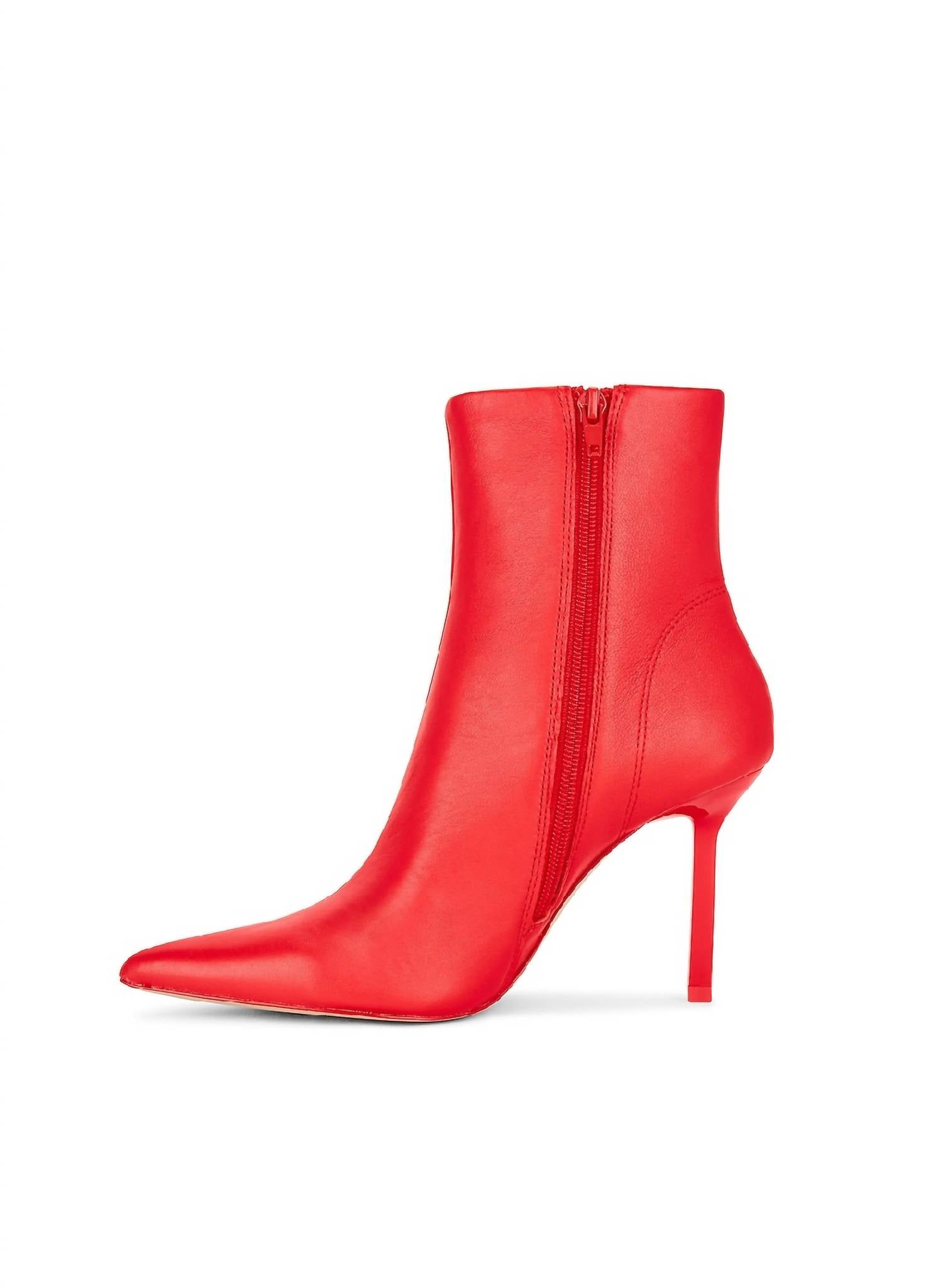 Say hello to the perfect, most versatile boot. The ankle height makes this style easily transition from day to night. Wear them with your favorite skinny jeans and tee for a more laid back look, or pair them with your favorite mini dress and jacket for a night out on the town. Leather upper with manmade sole Made in China Side zipper closure Pointed toe Stiletto heel Approx 90mm/ 3.5 inch heel Approx 140mm/ 5.5 inch shaft