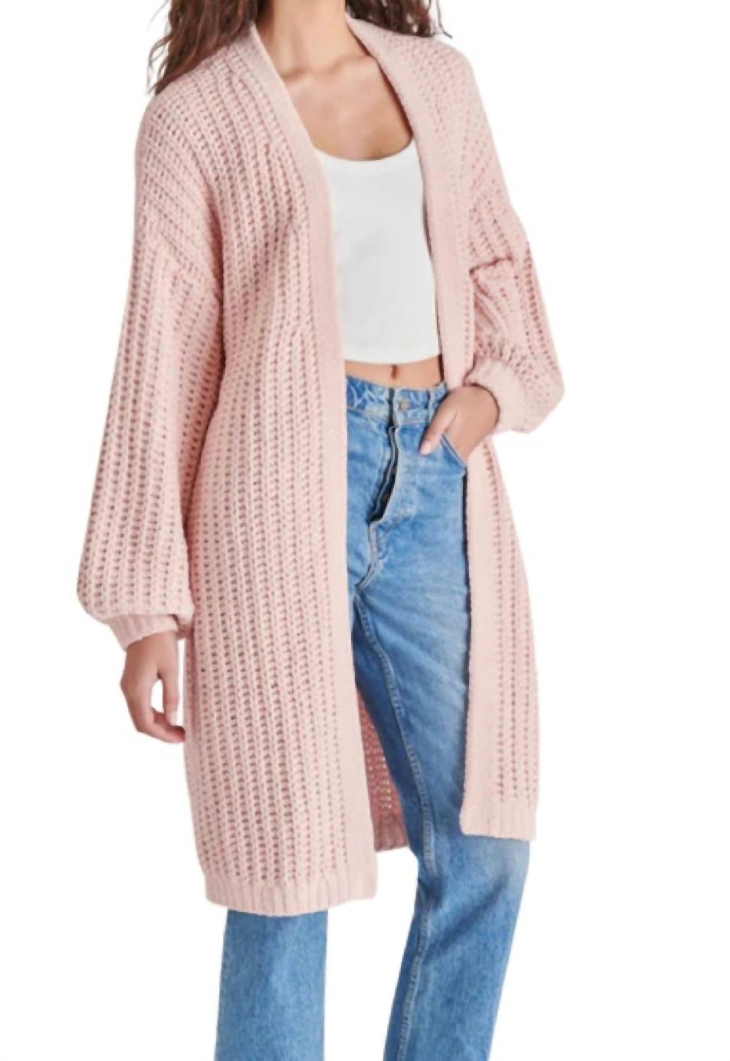 Introducing the Emmie Cardigan by Steve Madden, a delightful layering piece in a soft light pink hue. This women's cardigan features long sleeves and a crewneck design for ultimate comfort. Crafted from 100% recycled polyester, it offers a textured, eco-friendly option at a stylish midi length. Care: Hand wash.