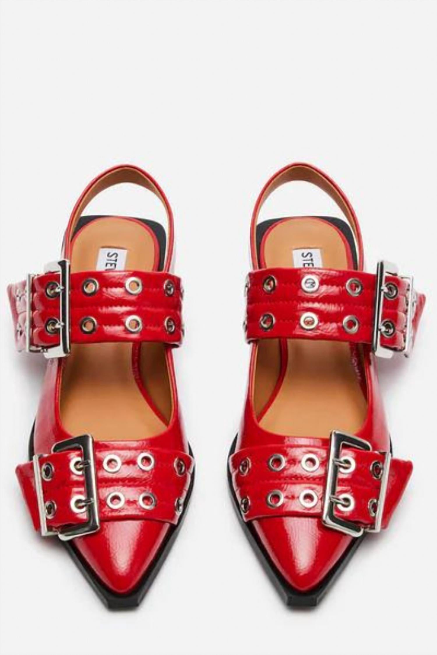 Elevate your spring wardrobe with the Steve Madden Graya Pointed Toe Flats, a chic choice for evening events and workwear. These red patent slingback flats feature a sleek angular silhouette with a snipped pointed toe and wide grommet straps, complete with an oversized buckle for added edge. Constructed with a synthetic upper, leather lining, and leather sock, these flats ensure comfort without compromising style. Made with a synthetic sole and featuring a slip-on design, these flats are imported and perfectly crafted for effortless day-long wear.