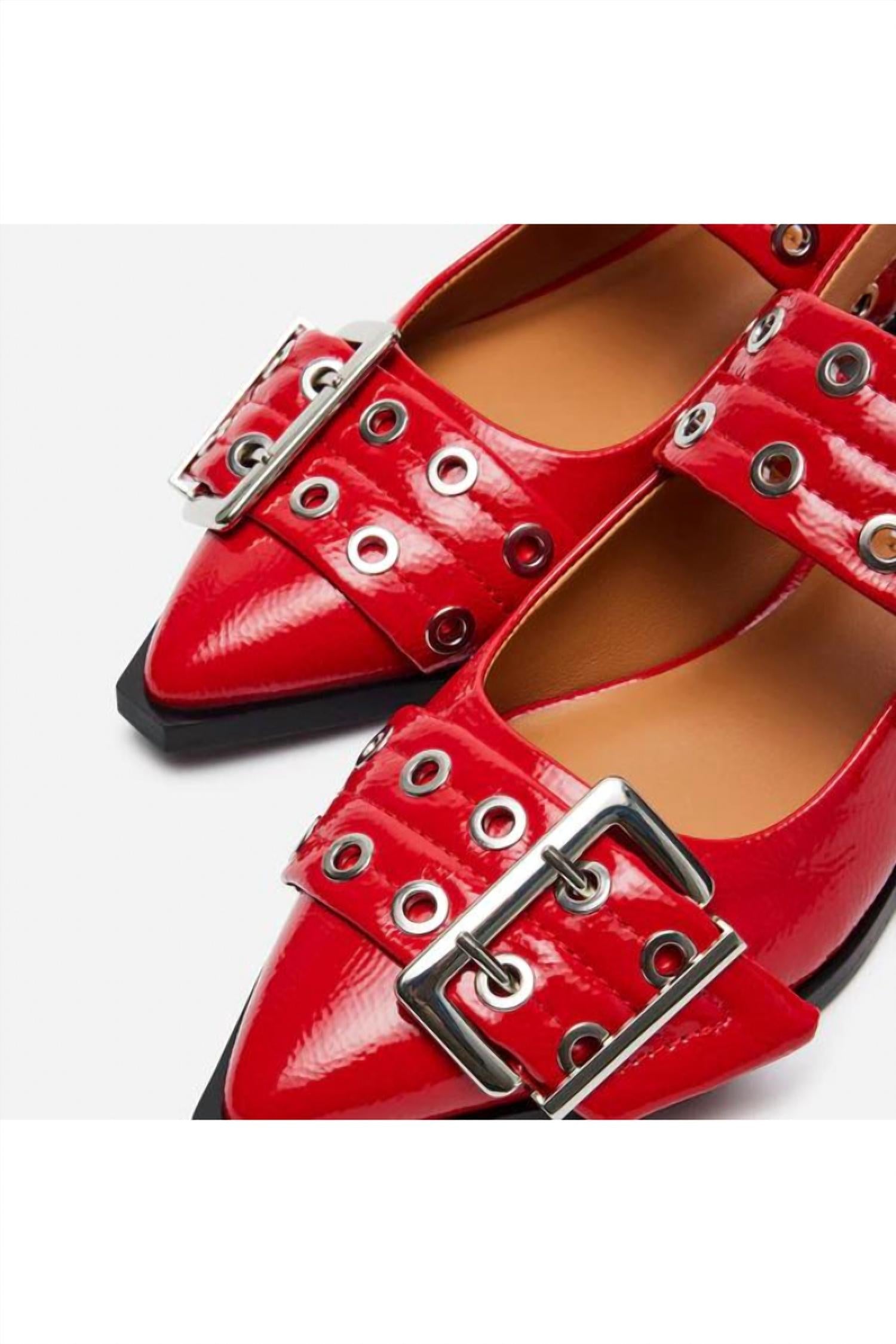 A classic loafer that is both comfortable and polished. Elevate your spring wardrobe with the Steve Madden Graya Pointed Toe Flats, a chic choice for evening events and workwear. These red patent slingback flats feature a sleek angular silhouette with a snipped pointed toe and wide grommet straps, complete with an oversized buckle for added edge. Constructed with a synthetic upper, leather lining, and leather sock, these flats ensure comfort without compromising style. Made with a synthetic sole and featuring a slip-on design, these flats are imported and perfectly crafted for effortless day-long wear.