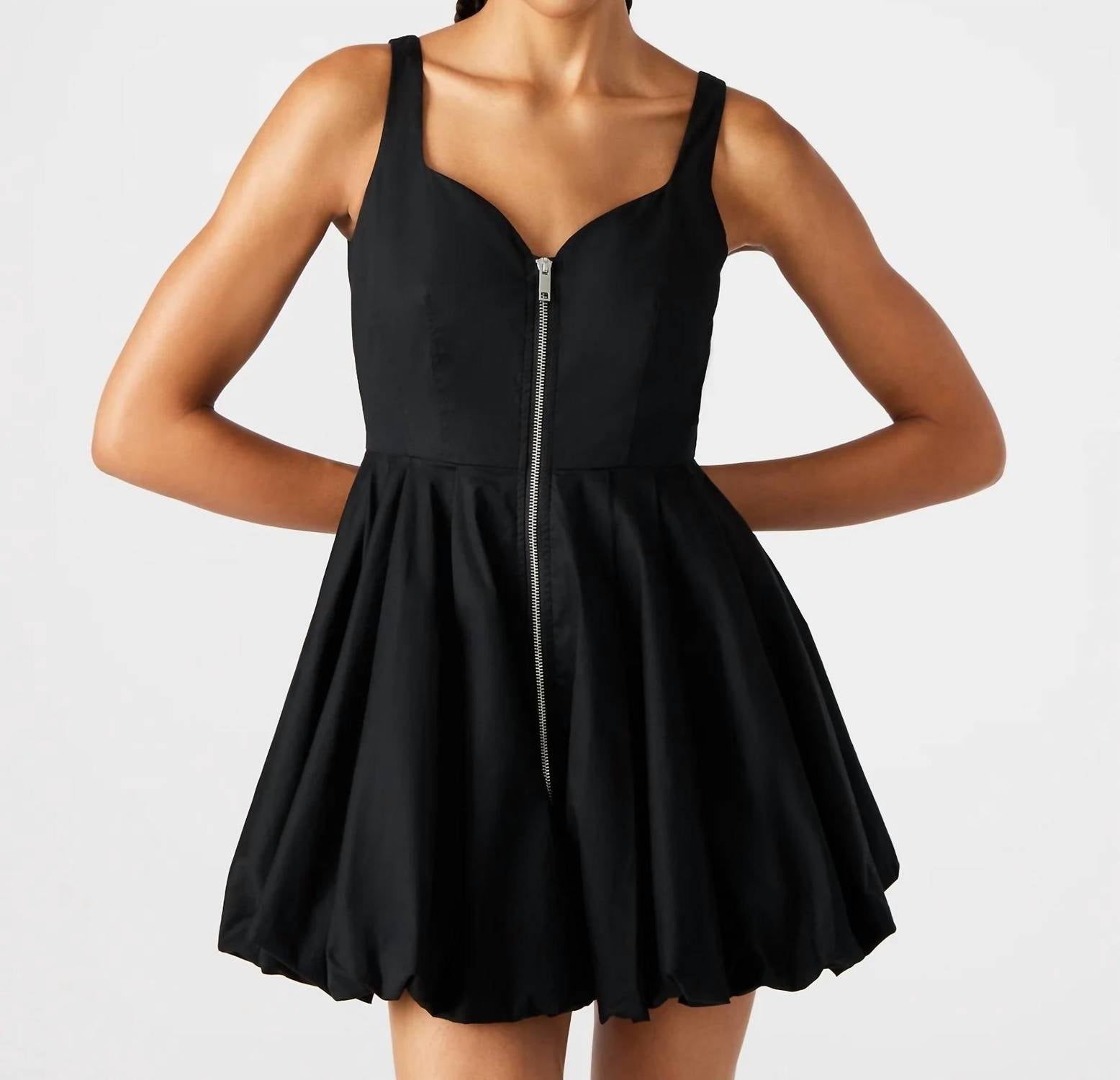 Introducing the Haiden Dress by STEVE MADDEN, a stunning sleeveless mini dress in timeless black. Crafted from a cotton blend comprising 96% cotton and 4% elastane, this stylish piece features a bubble hem and a sweetheart neckline that flatter any silhouette. With a convenient front zip closure, this imported dress is perfect for making a statement on special occasions. Care for it by hand washing to maintain its fabulous look.