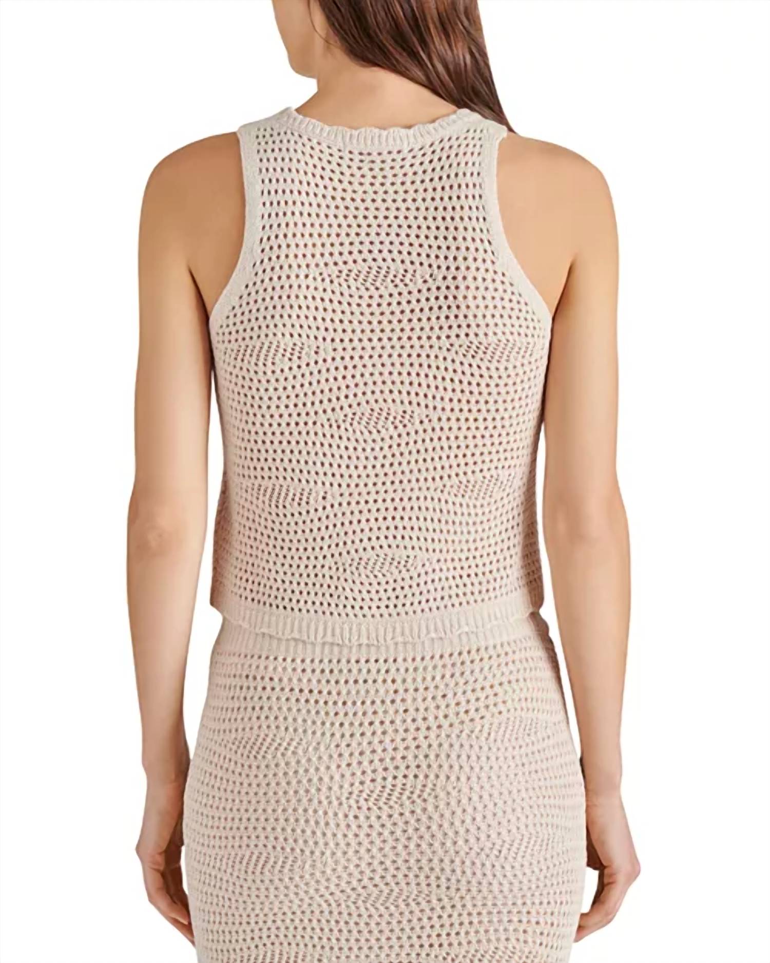 Introducing the Hannah Sweater Tank Top by STEVE MADDEN, a boho-chic essential for your summer wardrobe in Misty Rose. This sleeveless design features airy open stitching with cutaway shoulders, perfect for those warm vacation days. Composition: 100% Viscose. Closure: Pull-on style for easy wear. Care: Hand wash, lay flat to dry. Crafted from lightweight crochet fabric for a textured look.