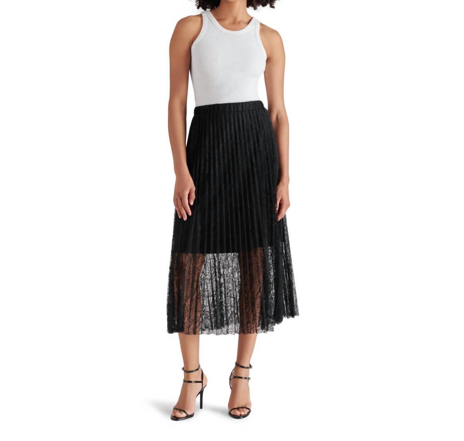 Tuck your favorite tee into this midi length skirt for an effortlessly cool look. Pleated lace overlay for a flowing, elegant effect. Vertical pleats for added movement and visual interest. Mid-length A-line silhouette that flatters all body types. Pull-on style with elasticized waistband for comfort.
