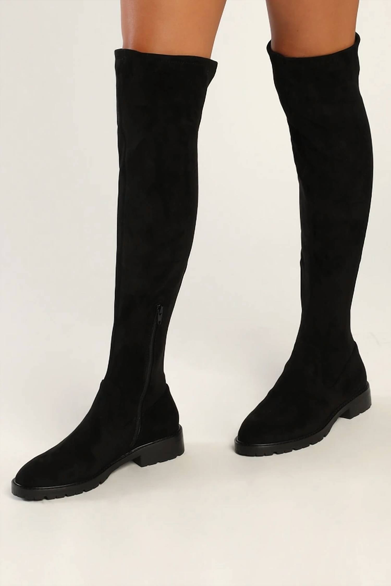 These stylish over the knee boots will look great with denim, dresses or skirts. You can't go wrong! Experience understated elegance with the Lizbeth Over-the-knee Boots by STEVE MADDEN, crafted in luxurious black suede. Featuring a minimalist design, these boots are perfect for the fall season and the back-to-school occasion. Designed with a round toe and a flat heel height of 1 1/4", they offer both style and comfort. Ideal for Thanksgiving gatherings, these boots embody a timeless appeal for the modern woman.