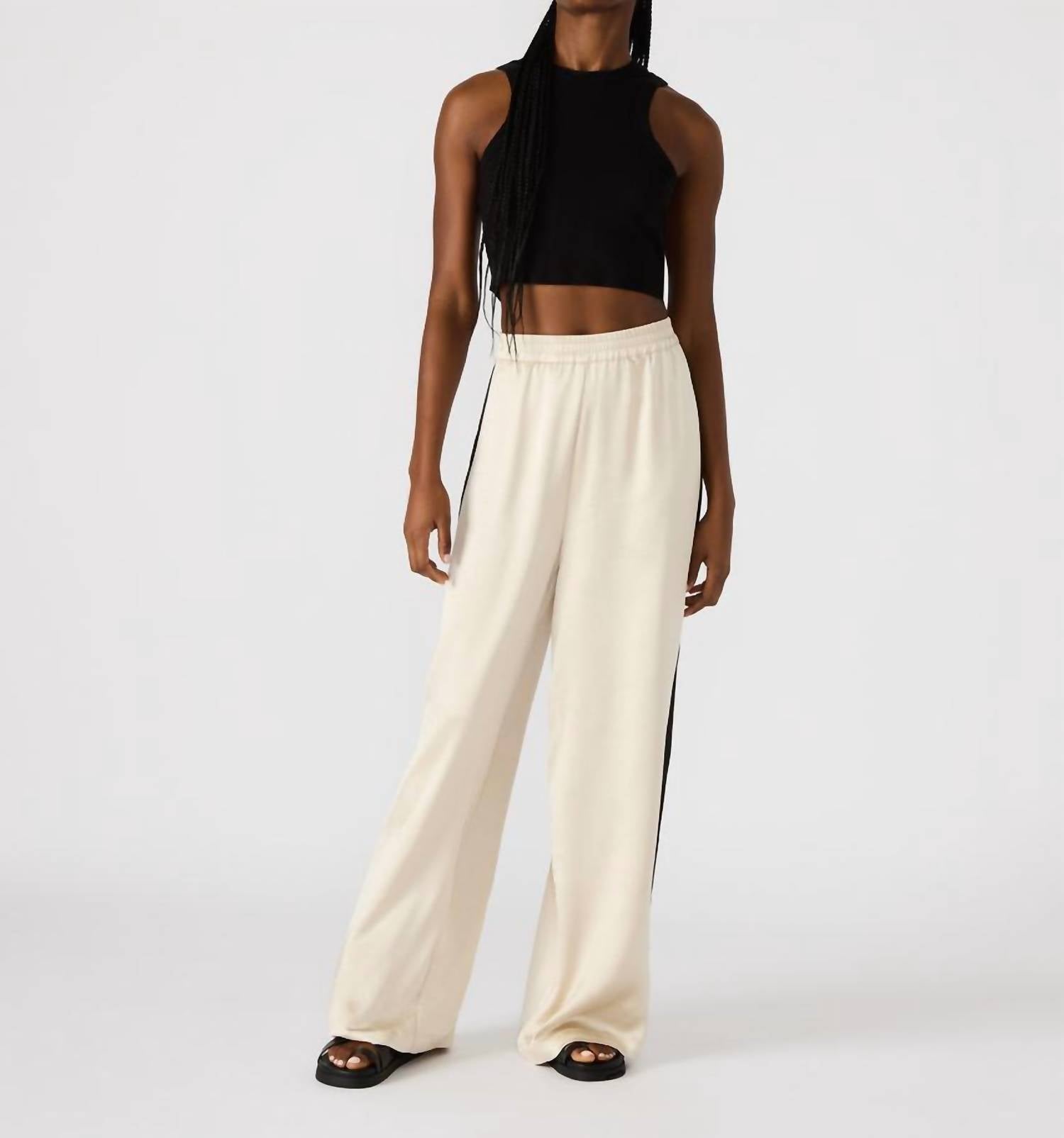 Introducing the Moxie Straight Leg Pant by Steve Madden, a chic addition to your wardrobe in a sophisticated cream color. These women's pants feature a sleek pull-on design with a comfortable elastic waistband and a standout contrast panel for a slimming effect. With pockets for convenience and a high rise, regular fit, these pants are crafted from 100% polyester with a straight leg style. Pair them with your favorite top for an effortless minimalist look perfect for spring vacations. Care instructions: Hand wash.