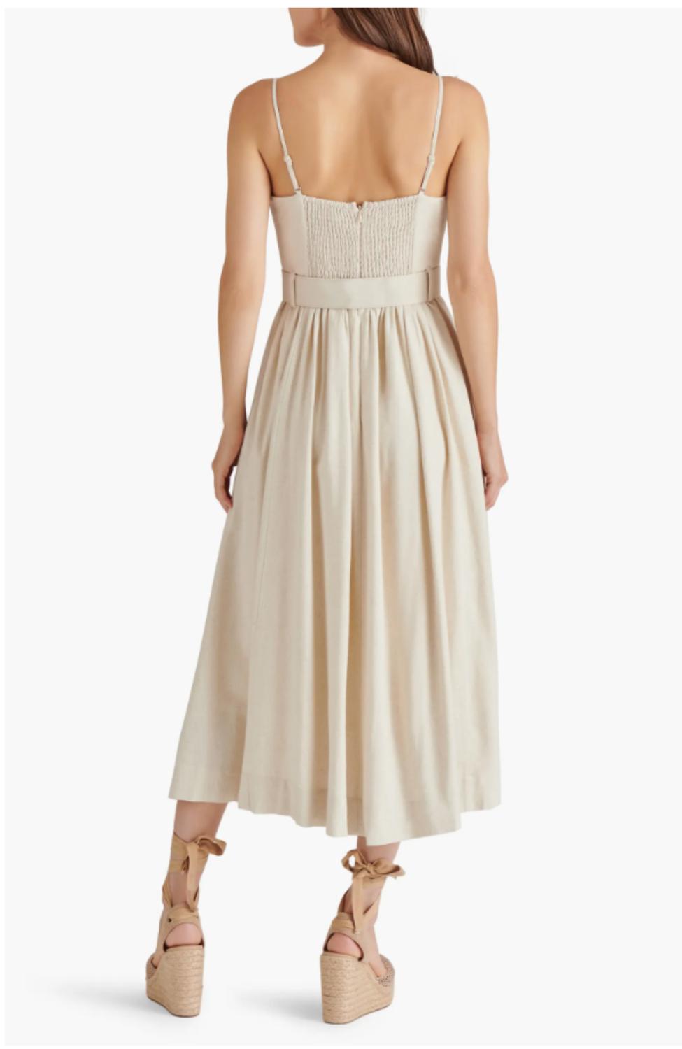 Introducing the Napoli Dress by STEVE MADDEN, an effortlessly chic addition to your vacation wardrobe. This midi dress features adjustable spaghetti straps and a flattering square neckline, complemented by an A-line silhouette with side-seam pockets. Made from a breathable linen blend composed of 55% linen and 45% rayon, it offers a natural, minimalist look perfect for spring getaways. Closure: Hidden back-zip closure. Ideal for warm-weather wear, its understated elegance suits various occasions.