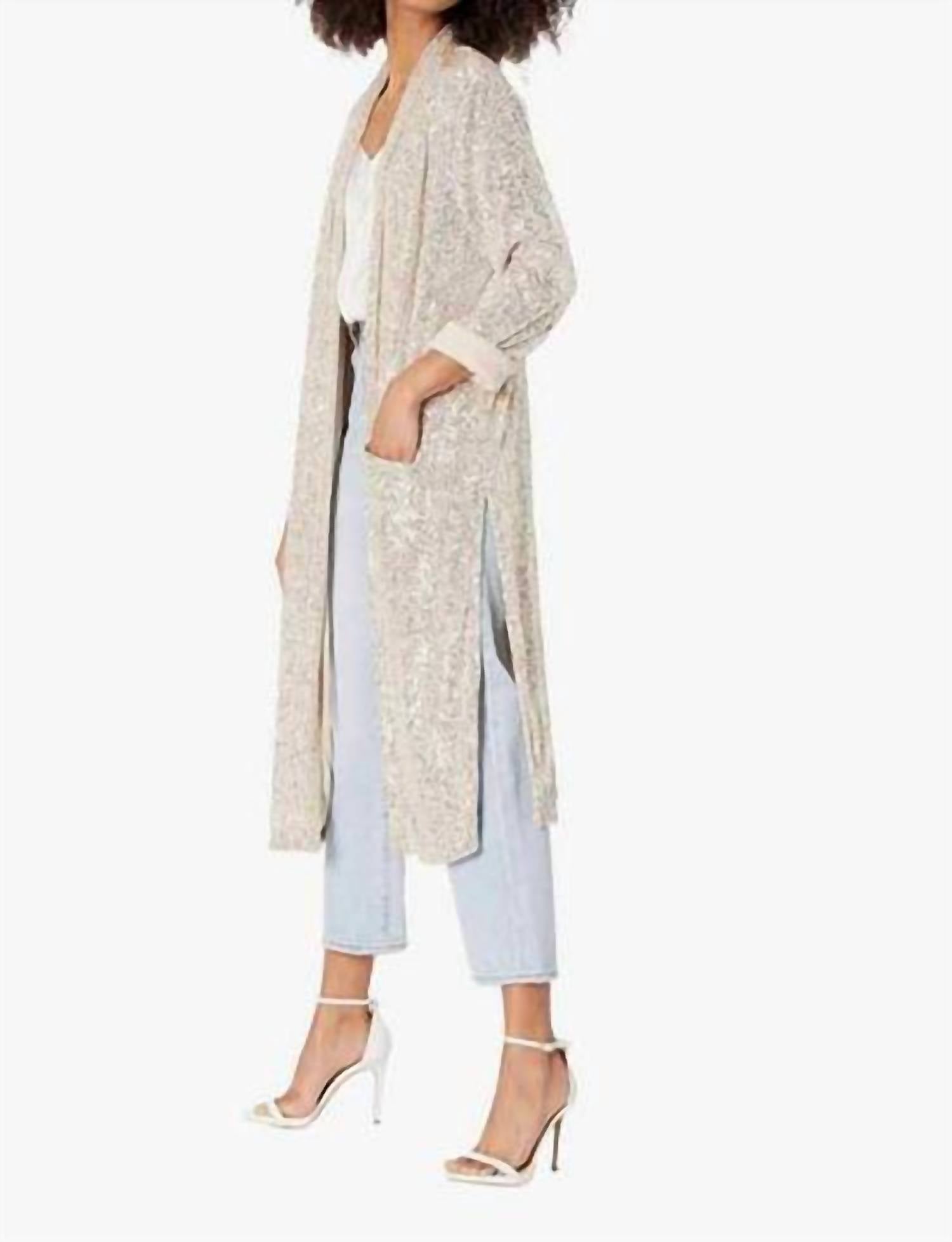 A classic fit that works just as good buttoned as it does left open.This open-front jacket features an inner drawstring tie, faux slip pockets, and side slits. Sequined embellishments throughout add a touch of glam. Made from 90% polyester and 5% elastane, with a 100% polyester lining. Hand wash. Made in China.