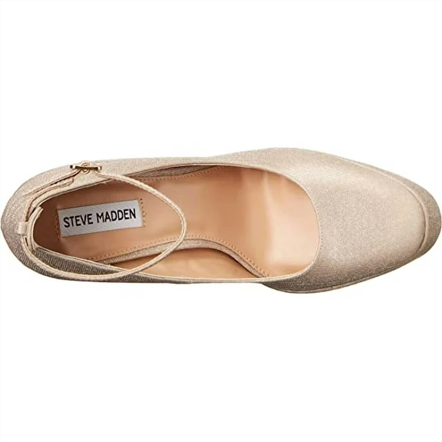 Synthetic rubber sole. Synthetic upper material and lining. Almond shape toe design. Adjustable ankle buckle closure. 6 inch platform block heel.