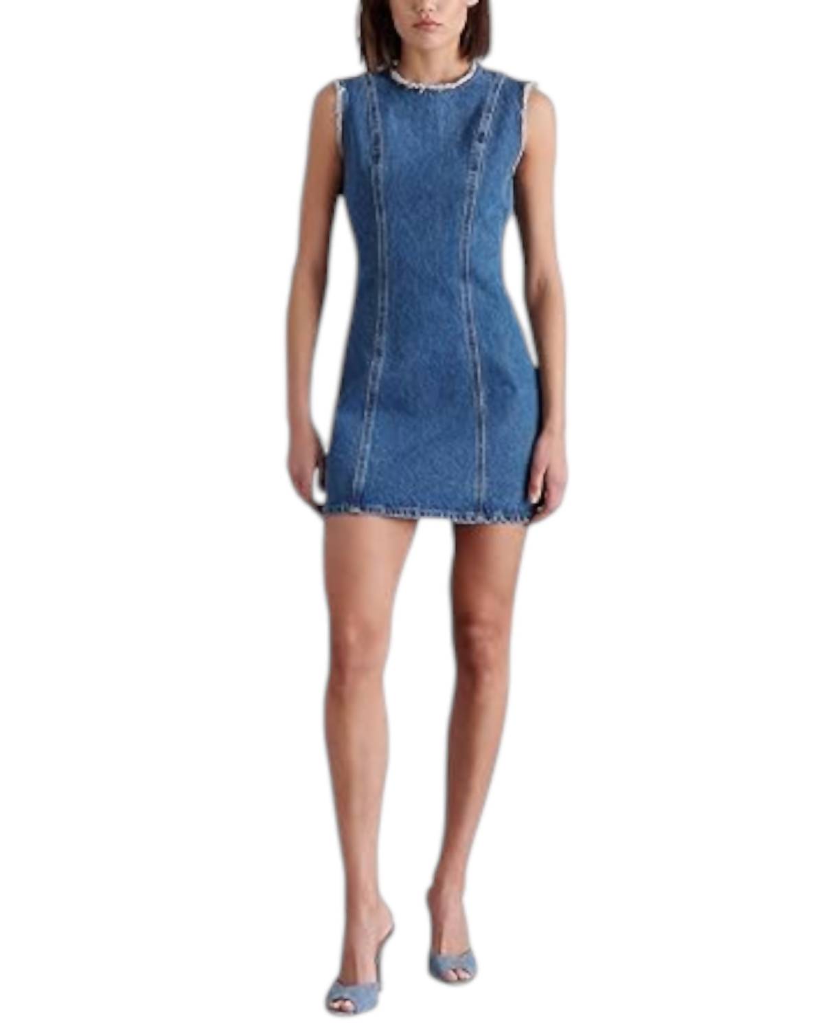 The kind of easy and flattering dress you'll be reaching for all season long. Make a statement with this sleeveless denim-colored bodycon mini dress. Crafted from a breathable 95% polyester and 5% spandex blend, it features a solid pattern, crewneck, and convenient zip closure. Easily care for it by machine washing in cold water on a gentle cycle. Perfect for any occasion!