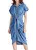 Elevate your wardrobe with the Stevie Chambray Midi Dress by STEVE MADDEN, perfect for summer workwear and holiday parties. This sophisticated casual dress features short sleeves and a point collar, crafted from 100% luxurious polyester chambray fabric in a chic blue solid pattern. Its button-down closure and stylish tie-front detail add to its elegant wrap silhouette. This 41.5" midi dress is machine washable and tumble dry-friendly for effortless care.