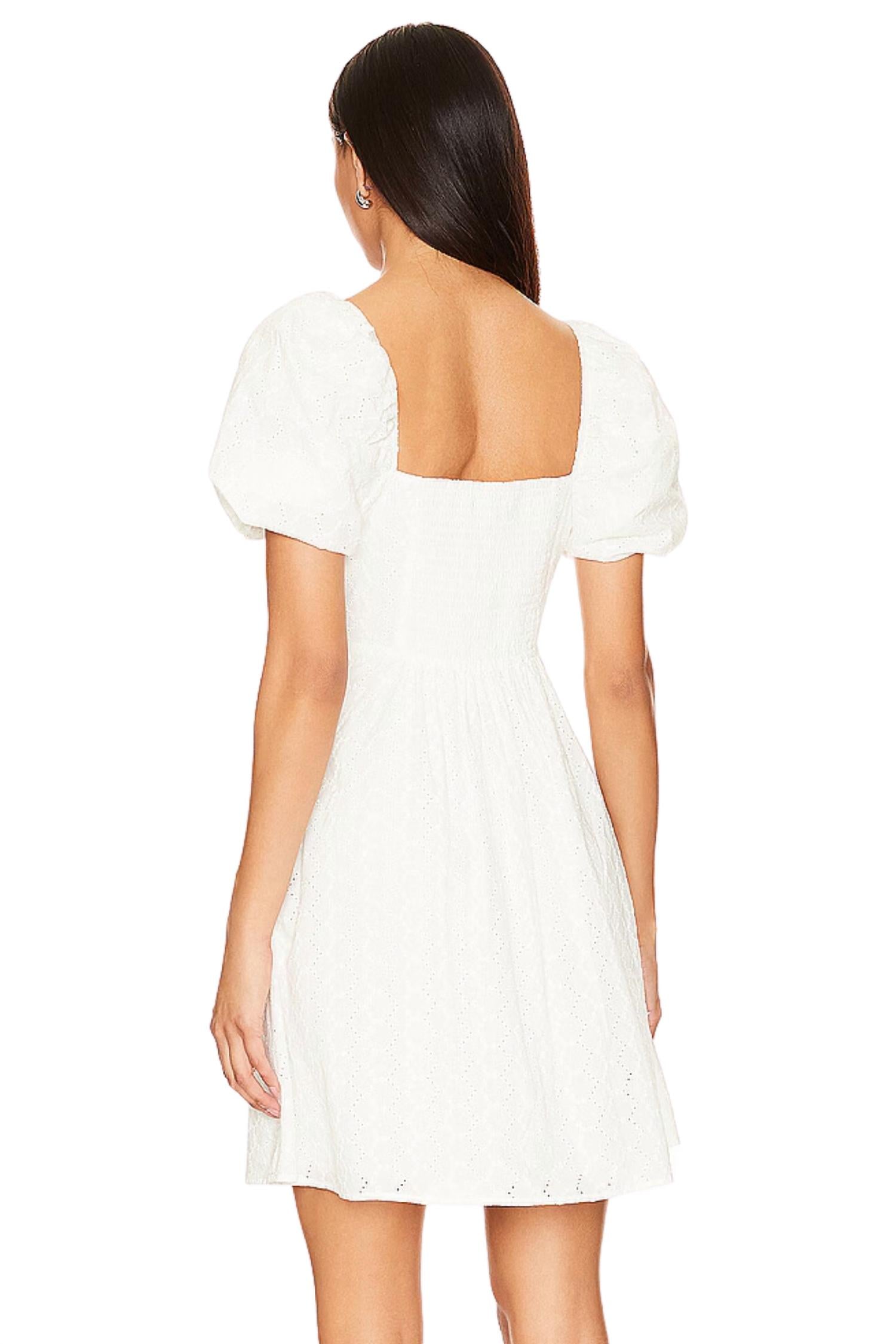 Mini-length dress with a flirty and stylish look. The front lace-up tie detail adds a playful and feminine touch. Side seam pockets for added functionality. Smocked back for a snug yet comfortable fit. Midweight eyelet fabric provides a textured, airy feel. 100% Cotton. Machine wash. cold on delicate cycle. Line dry or tumble dry low. Cool iron if needed.