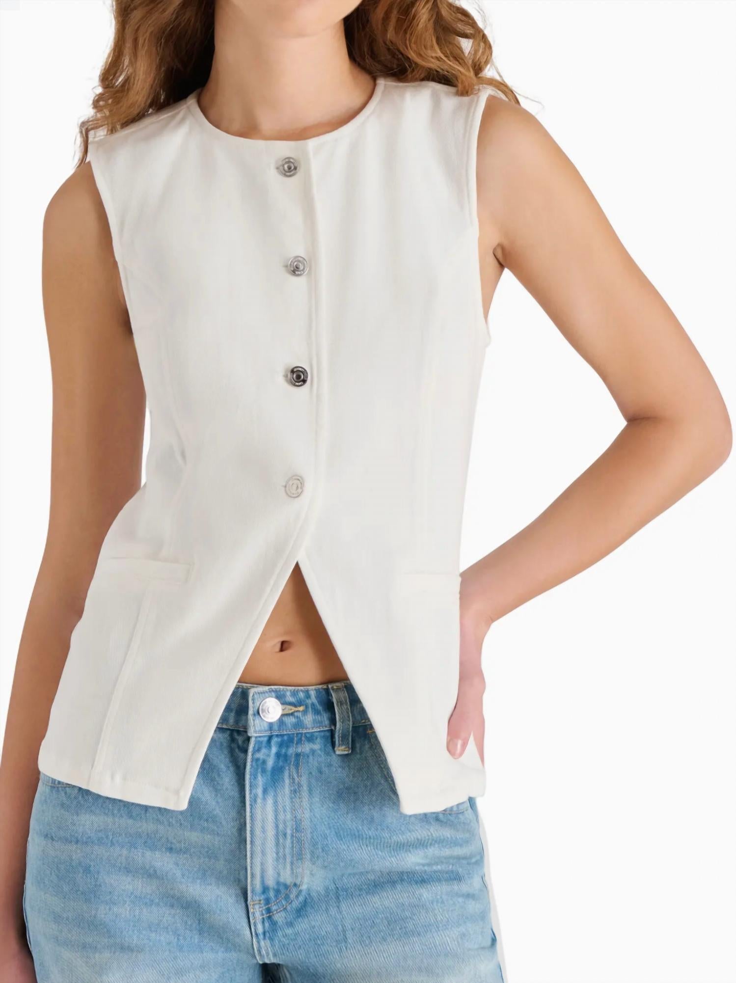 That extra layering piece you didn't know you needed! The Wesley Button-up Vest by Steve Madden is a chic addition to any summer wardrobe, featuring a sleeveless design for warm-weather versatility. Expertly crafted from a stretch-enhanced cotton blend (97% cotton, 3% spandex) in a longline cutaway silhouette, this vest offers a tailored yet relaxed look. It includes a jewel neck, front welt pockets, and a practical front button closure. Originating from imported materials, this vest is easy to care for with machine wash and tumble dry instructions.