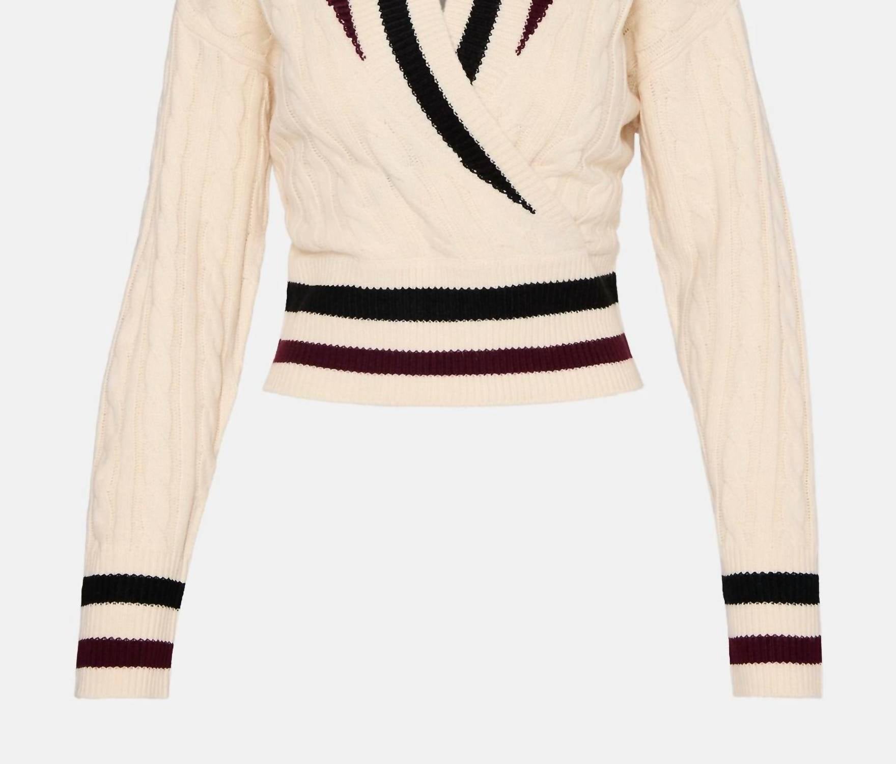 A classic fit that works just as good buttoned as it does left open. Elevate your style with the Women's Addison Cream Sweater by Steve Madden, a pullover designed with varsity-inspired striping and a chic faux wrap. This versatile piece features a high collar with an open V-neck, perfect for wearing on or off the shoulders. Made from 100% acrylic and imported, it boasts a stylish length of 20.5 inches. Closure: Pull-on. Care: Hand wash. Model perspectives: Kate (5'9", large) and Sophie (5'10", small).
