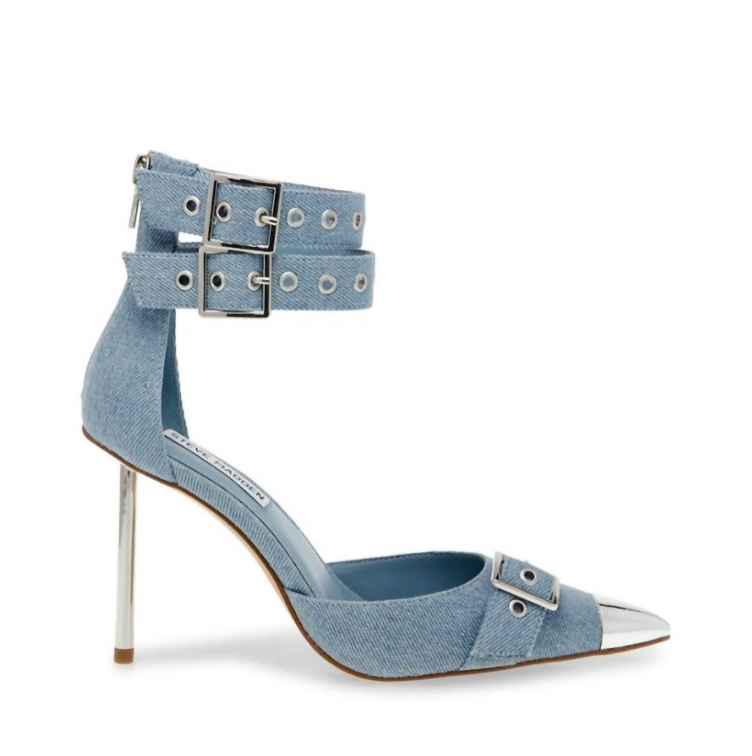 The perfect height for day to night. Polished grommets and a pointy toe dial up the modern moto style of this lofty stiletto pump. 4" heel. Textile upper. Synthetic lining and sole. Imported.