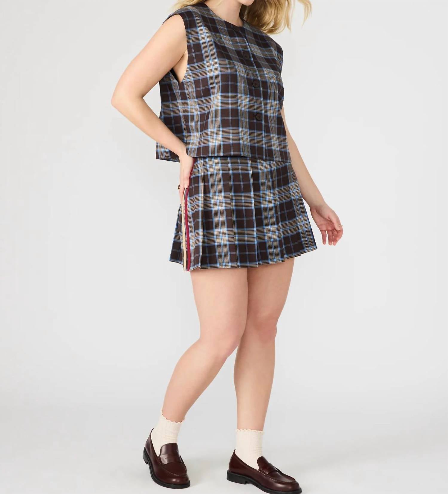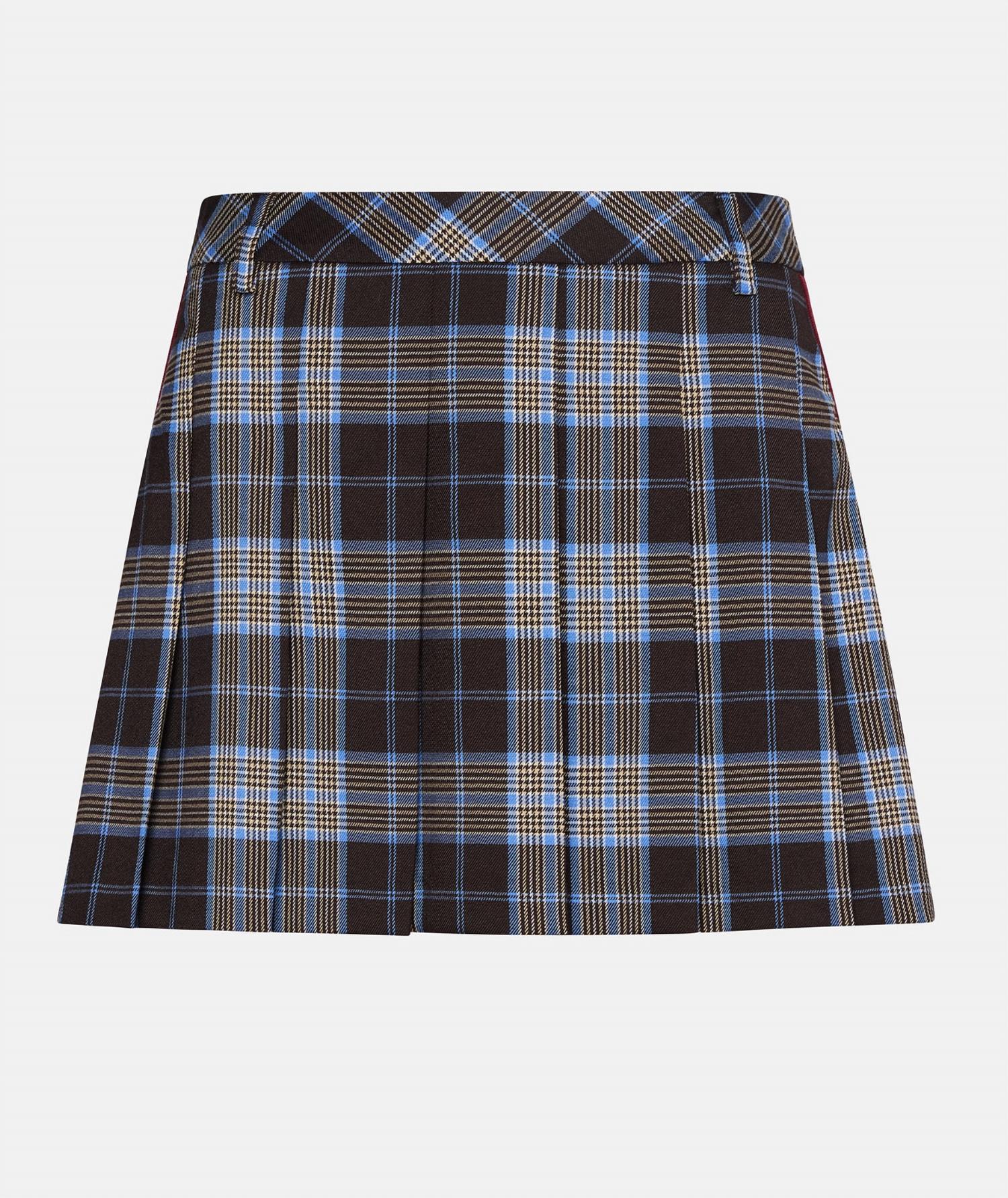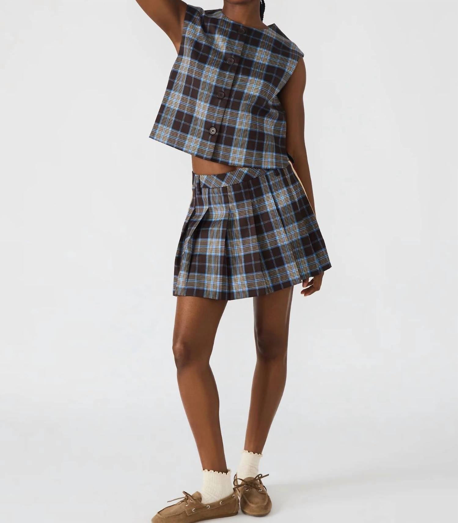 Tuck in your favorite tee for a more laid-back vibe. Elevate your summer wardrobe with the Women's Plaid Margo Skirt by STEVE MADDEN, a perfect blend of comfort and style in brown blue. This plaid pleated mini skirt is crafted with 97% polyester and 3% elastane, featuring a stretch lining for a flawless fit. Made to move with you, it boasts belt loops and a convenient zip closure. Care instructions specify hand wash only. Model Kate, 5'9", wears a size 10, while Nayla, 5'10", wears a size 4. Imported.
