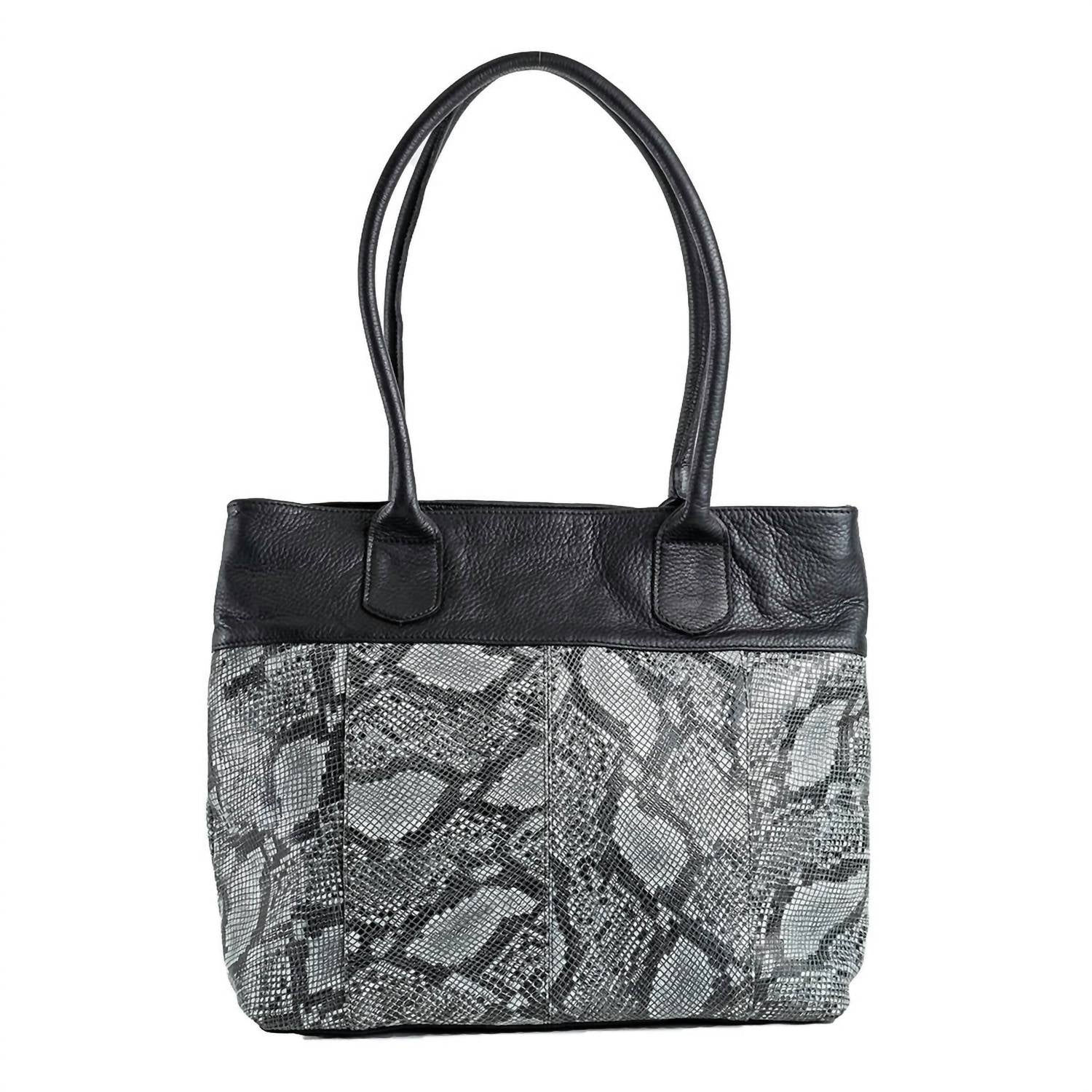The perfect throw-it-in-and-go bag for your next weekend away or beach vacation! Its classic design will never go out of style and you'll be reaching for this bag season after season. Chic addition to any wardrobe with its black genuine leather, embossed to mimic the elegance of snakeskin. Expertly crafted, features a secure zip top closure, dual rolled shoulder straps, and a spacious main compartment for ultimate convenience. With added functionality, it includes two exterior zip pockets, two interior slip pockets, one interior zip pocket, and a key clasp. Dimensions are 15" W x 14" H x 6" D, making it a perfect blend of style and practicality.